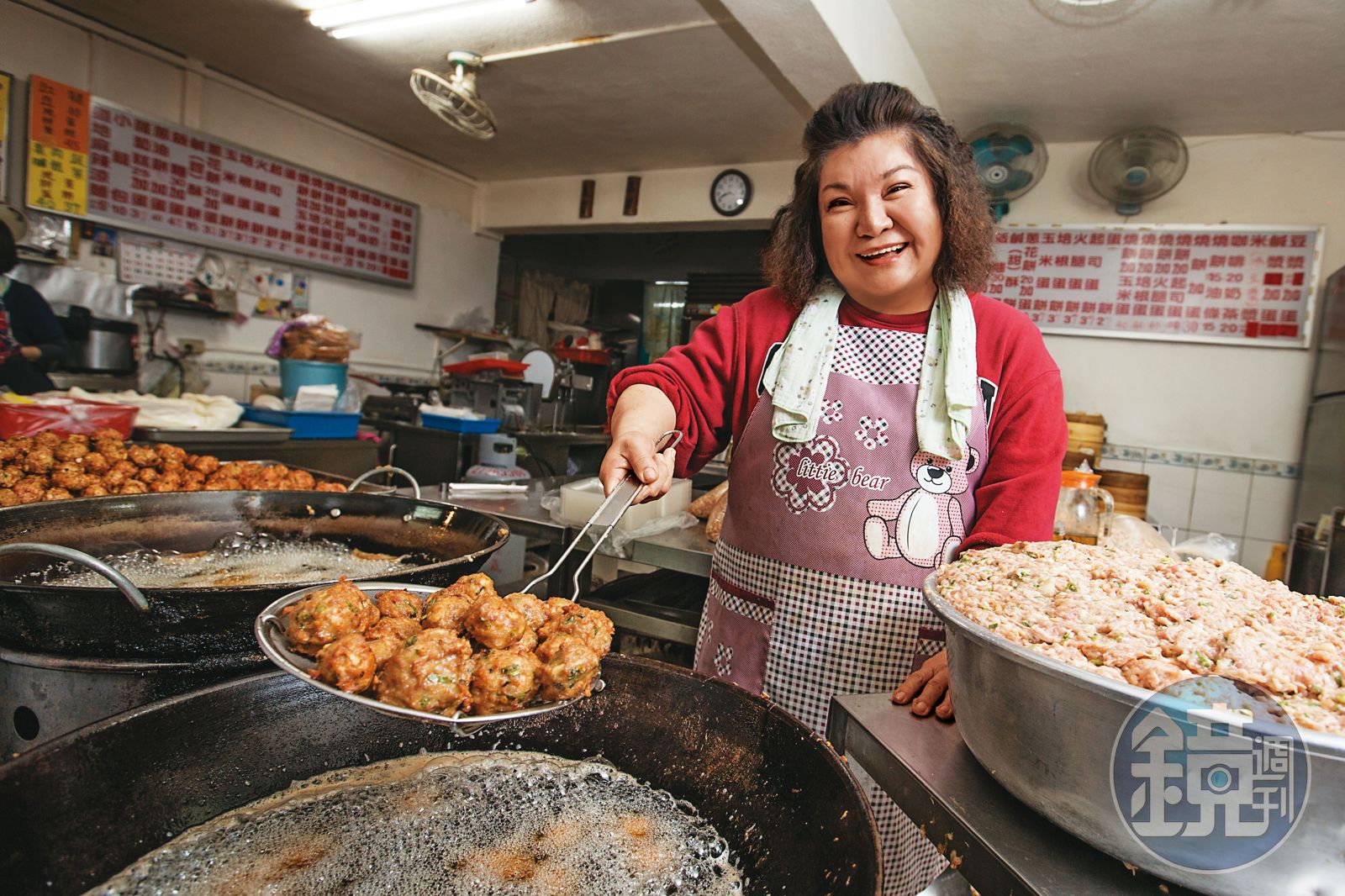 經營早餐店,最招牌的卻是獅子頭。店中央擺了二口大鍋,一顆顆肉丸在高溫熱油裡鬧騰,外觀從粉色轉為金黃,逼出誘人的香氣就能撈起。「我們沒有什麼獨家祕方,所有東西比例調好就對了。」使用瘦肥二比一的溫體豬肉,加入糖、醬油、麻油等調料,再放入荸薺、蔥花打勻;一口咬下,肉汁流出,甜味在嘴巴蔓延。秦菲菲得意地透露:「很多大老闆叫司機來買,還有一些餐廳來跟我買回去賣,價錢貴好多。」