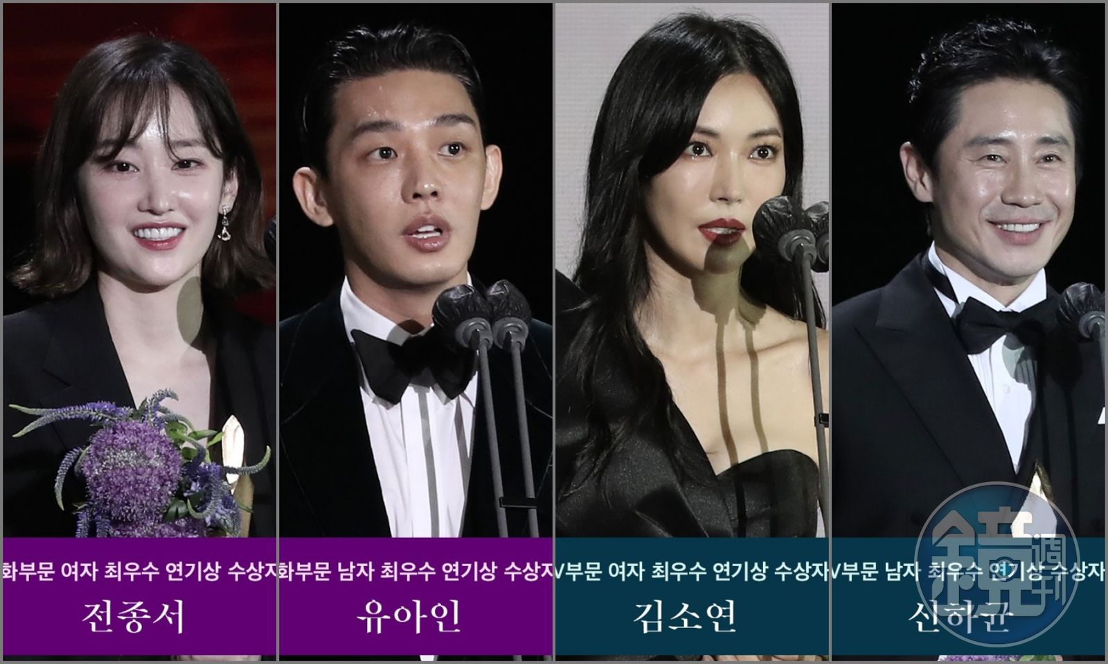 電影男女配角則由《魔鬼對決》朴正民與《三姐妹》金善映獲得,朴正民首度挑戰跨性別角色,還為角色剃了腳毛;朴正民致詞時提到同片演員在頒獎會場相遇,竟問:「今天為什麼穿男裝?」讓他無奈回答:「我本來就是男的啊。」在《請回答1988》演出高庚杓母親的金善映,在《三姐妹》中演出個性圓滑的二姐,卻是個宗教狂熱者,對於自己得獎,金善映激動得直說:「從沒想到能拿到這麼大的獎」。