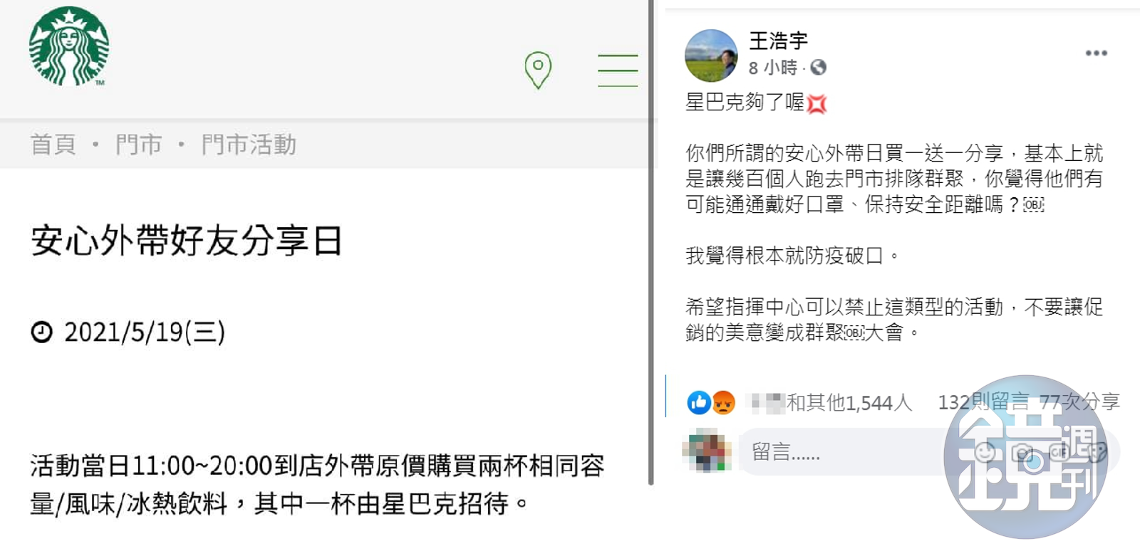 對此王浩宇不滿指出,所謂安心外帶日的活動,「基本上就是讓幾百個人跑去門市排隊群聚,你覺得他們有可能通通戴好口罩、保持安全距離嗎?」他痛批這簡直就是防疫破口,「希望指揮中心可以禁止這類型的活動,不要讓促銷的美意變成群聚大會。」