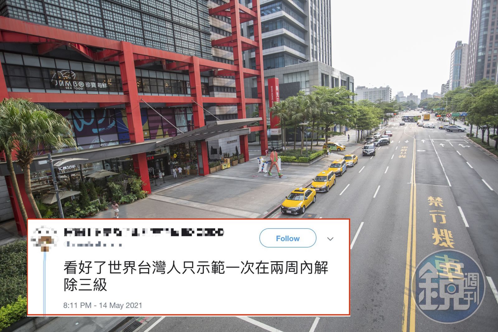 進入第三集警戒後,台北市瞬間進入「空城」狀態(大圖,本刊資料照),一名台灣網友在推特寫下「霸氣21字宣言」,提振台灣人防疫氣勢。(小圖,翻攝推特)發布時間:2021.05.16 18:12 臺北時間