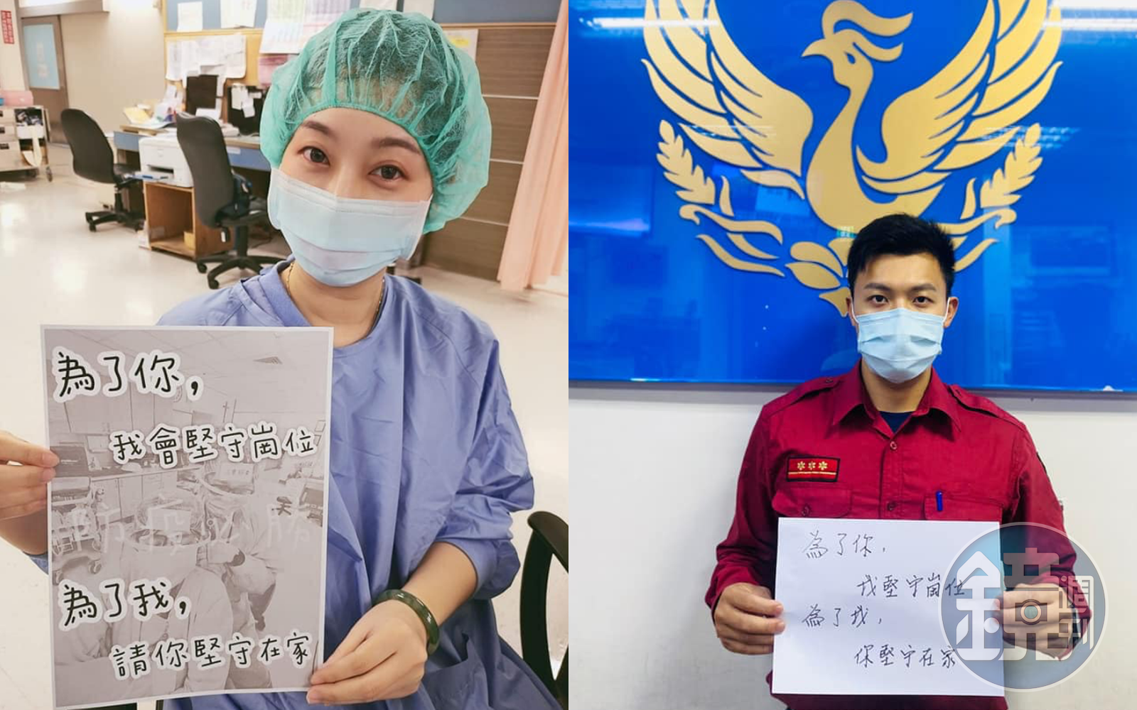 數名三軍總醫院的呼吸治療師在去年發生本土個案時,引用國外醫護人員的宣導標語,寫下「為了你,我堅守崗位;為了我,請你堅守在家」字句,並拍下照片貼上臉書,想要宣導大家不要去公共場合,並表示醫療人員會為了大家堅守崗位共同抗疫,一般民眾能做的就是盡量別去公眾場合趴趴走,「請你們堅守在家共同防疫。」