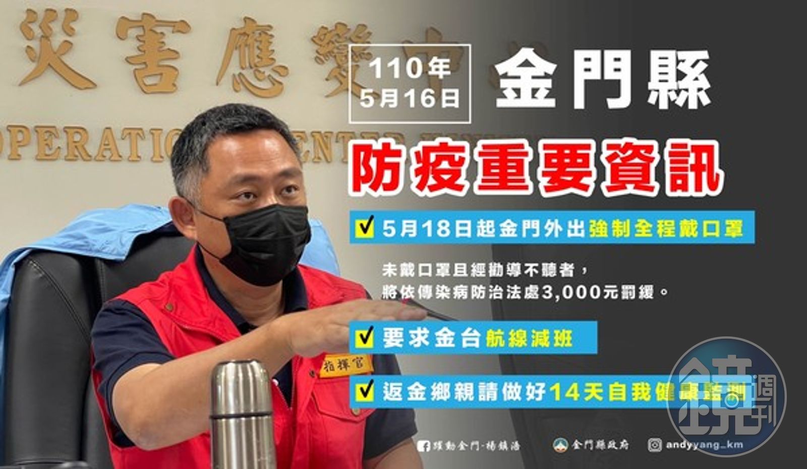 金門縣長楊鎮浯指出,自明(18)日起,金門民眾外出全面強制戴口罩,16、17日為宣導期,未配戴口罩且勸導不聽者,將依照傳染病防止法處3000元罰緩。 楊鎮浯也要求減少各航空站飛往金門的班次,僅保留當地人必要往返航班,管制入金門人流。各單位機關至28日前,暫停所有公務赴台出差,除非經過專案奉准。若從金門至台灣本島返鄉,請做好14天自我健康監測,避免前往公共場所,若民眾出現染疫相關症狀,請依指示就醫並前往篩檢。