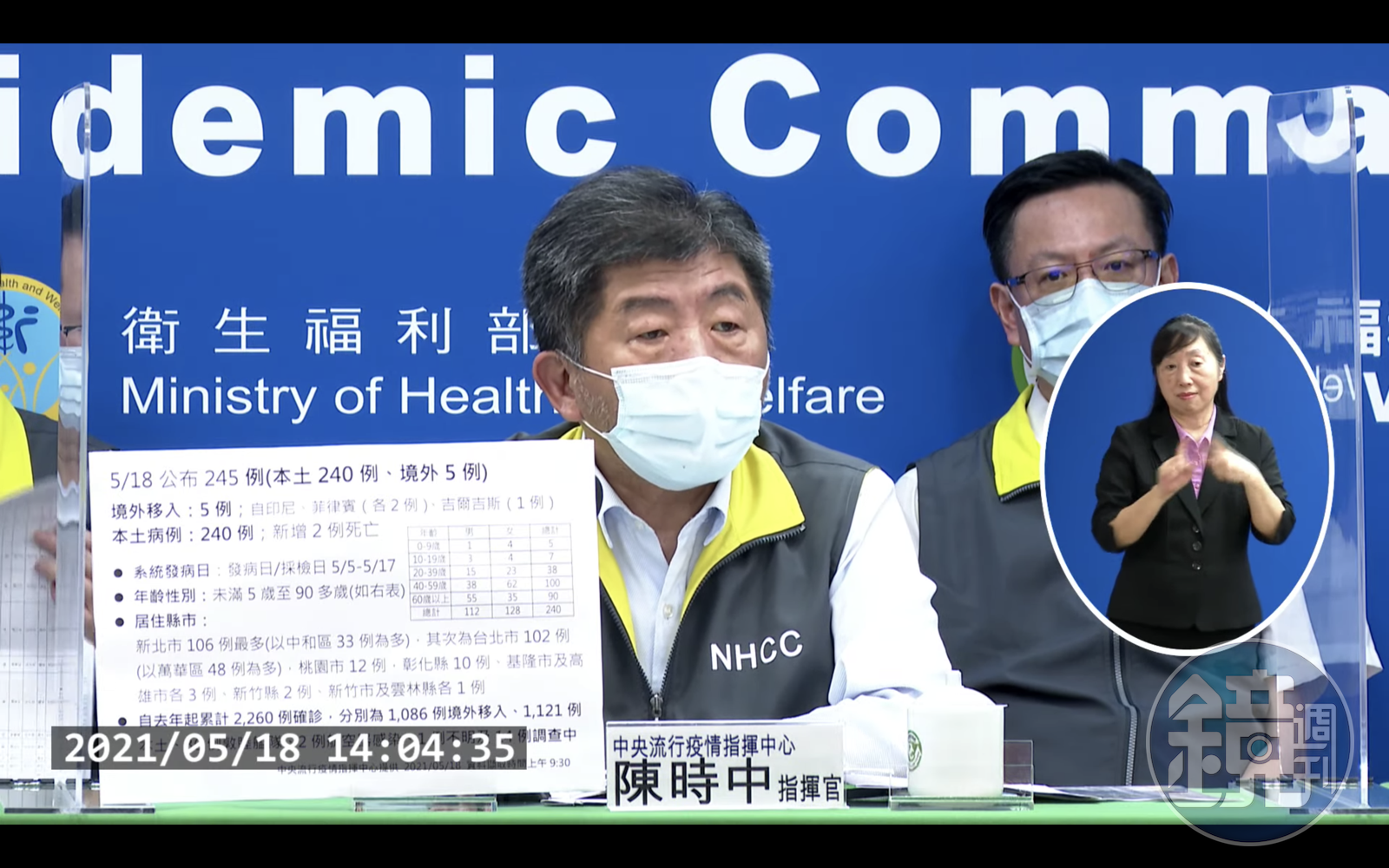 陳時中指出,新增的240例本土個案為112男性與128女性,年齡介於未滿5歲至90多歲,發病日/採檢日介於5月5日至5月17日,居住縣市分別為新北市106例(中和區33例最多)、台北市102例(萬華區48例最多)、桃園市12例、彰化縣10例、基隆市及高雄市各3例、新竹縣2例、新竹市及雲林縣各1例。其中台北茶藝館88例、萬華區活動史67例、某社團相關群聚2例、進香團2例、宜蘭遊藝場1例。群聚關聯不明51例、疫調中29例。相關疫情調查持續進行中。