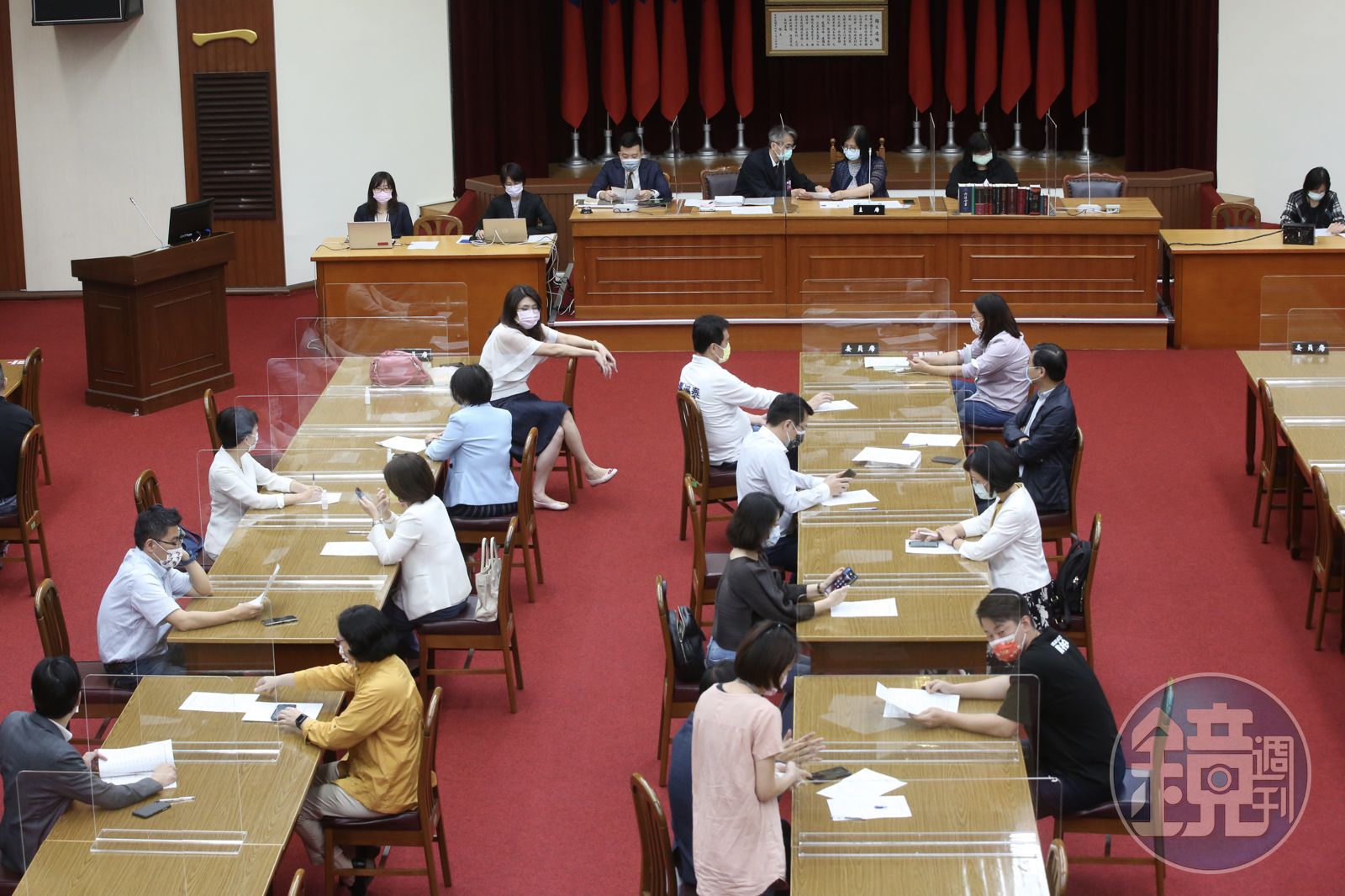 為加強防疫,立法院9樓大禮堂會議室加寬座位間隔、採梅花座,並在每個座位間設置透明隔板,現場禁止飲食、與會者強制戴口罩並需實聯制。