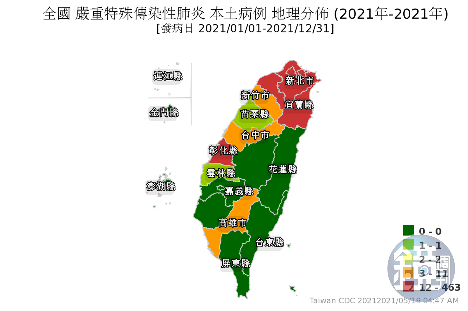 據疾管署官網數據顯示,台灣今年本土病例截至昨(18日)共1064例,紅色燈號的有新北市463人、台北市459人、桃園市66人、彰化縣30人、宜蘭縣18人、基隆市13人;橙色燈號有新竹縣4人、台中市4人、高雄市4人;新竹市、苗栗縣、雲林縣則為各1人確診的淺綠色燈號。