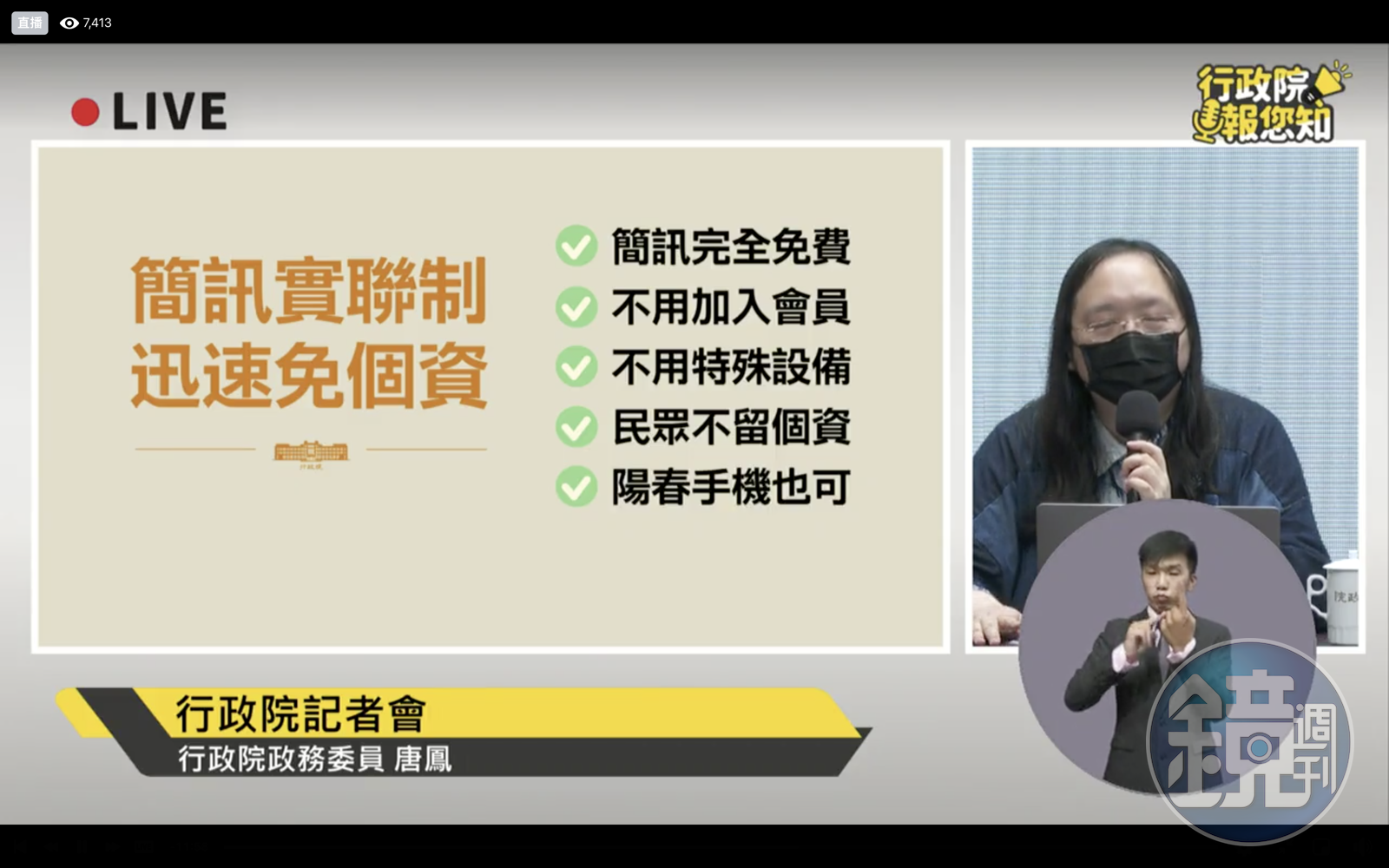 唐鳳進一步補充,由於是傳送到電信業者,因此沒有網內網外互通問題,並感謝五大電信,不會收取簡訊費用,若手機系統跳出收費訊息只需按「知道了」即可,事實上不會收任何費用。