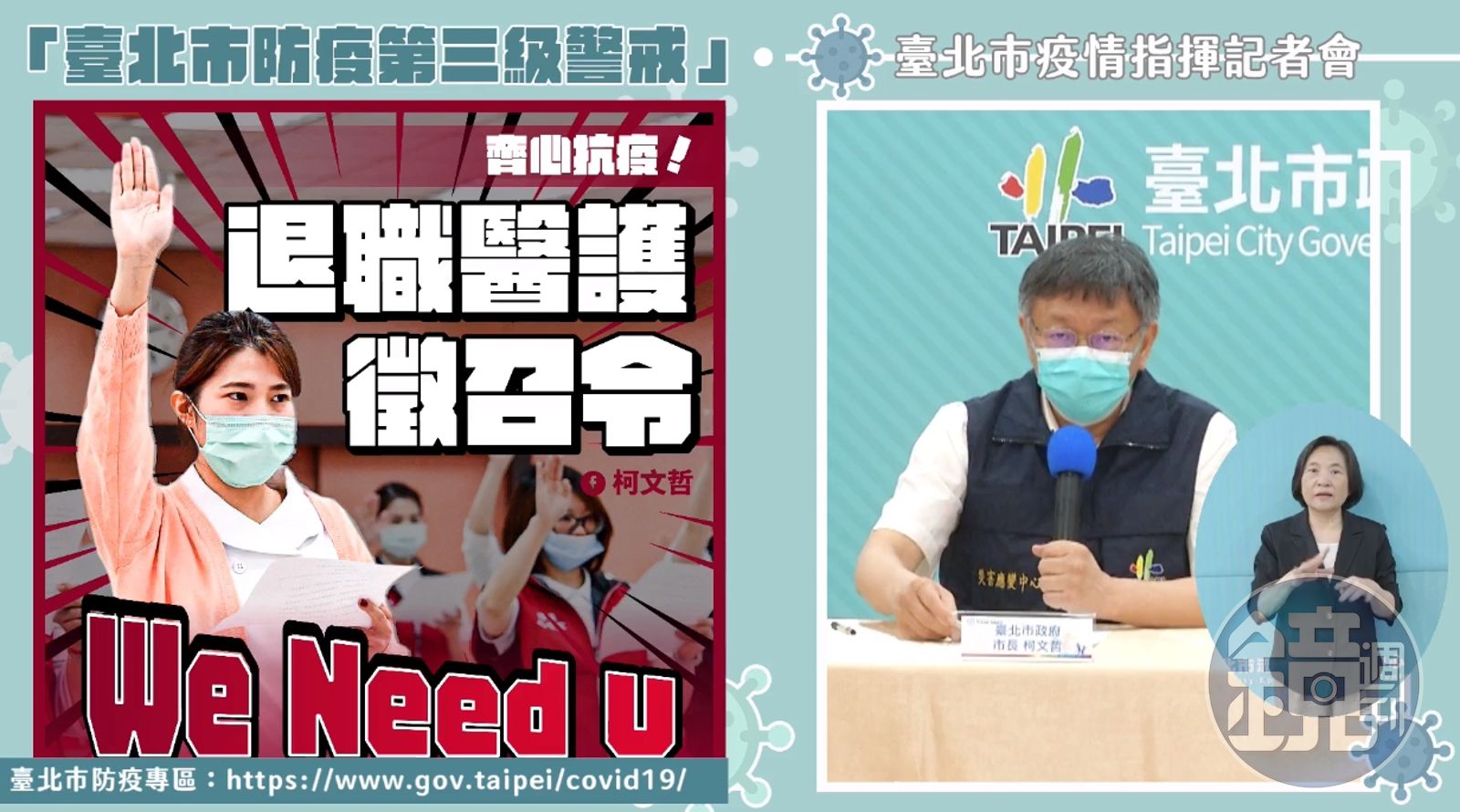 柯文哲提及,現在統計上看來,確診者只有20%需要醫院、4%需要加護病房,也就是說確診者不一定馬上送到醫院,甚至將來有些確診者會直接在防疫旅館就出院、解除隔離;雖然放到防疫旅館,但還是要有醫護人員監測,柯文哲在此呼籲,向台北市的退休、離職的醫療人員發出徵集令,「現在國家需要你們到防疫前線作戰,防疫旅館、檢疫所的病人監看」。