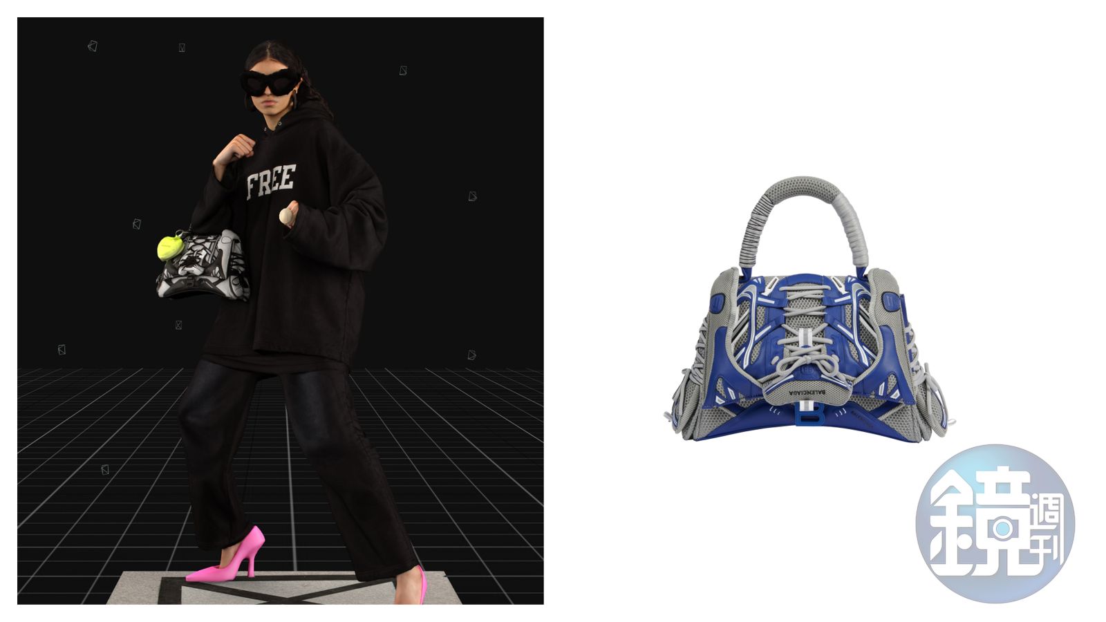 融合品牌兩大經典產品Track運動鞋和Hourglass沙漏包的全新設的Sneakerhead系列包款計,包身的材質選取自經典的Track運動鞋,進行再次糅合拼接,曲線型的底部以及B logo的設計則源自品牌經典的沙漏包。 Top Handle Sneakerhead包款共由210塊裁片精心拼接而成,其中80塊為Track運動鞋的現有部件。每一支Sneakerhead包款需經由制鞋縫紉機和工匠手工的雙重縫製,歷時三天方才製作完成。手袋頂部和側面分別綴以打結的系帶,配有可調可拆卸肩帶、隱形後袋及磁扣開合,一側繡有倒置的Balenciaga logo,於細節之處彰顯其實用性。
