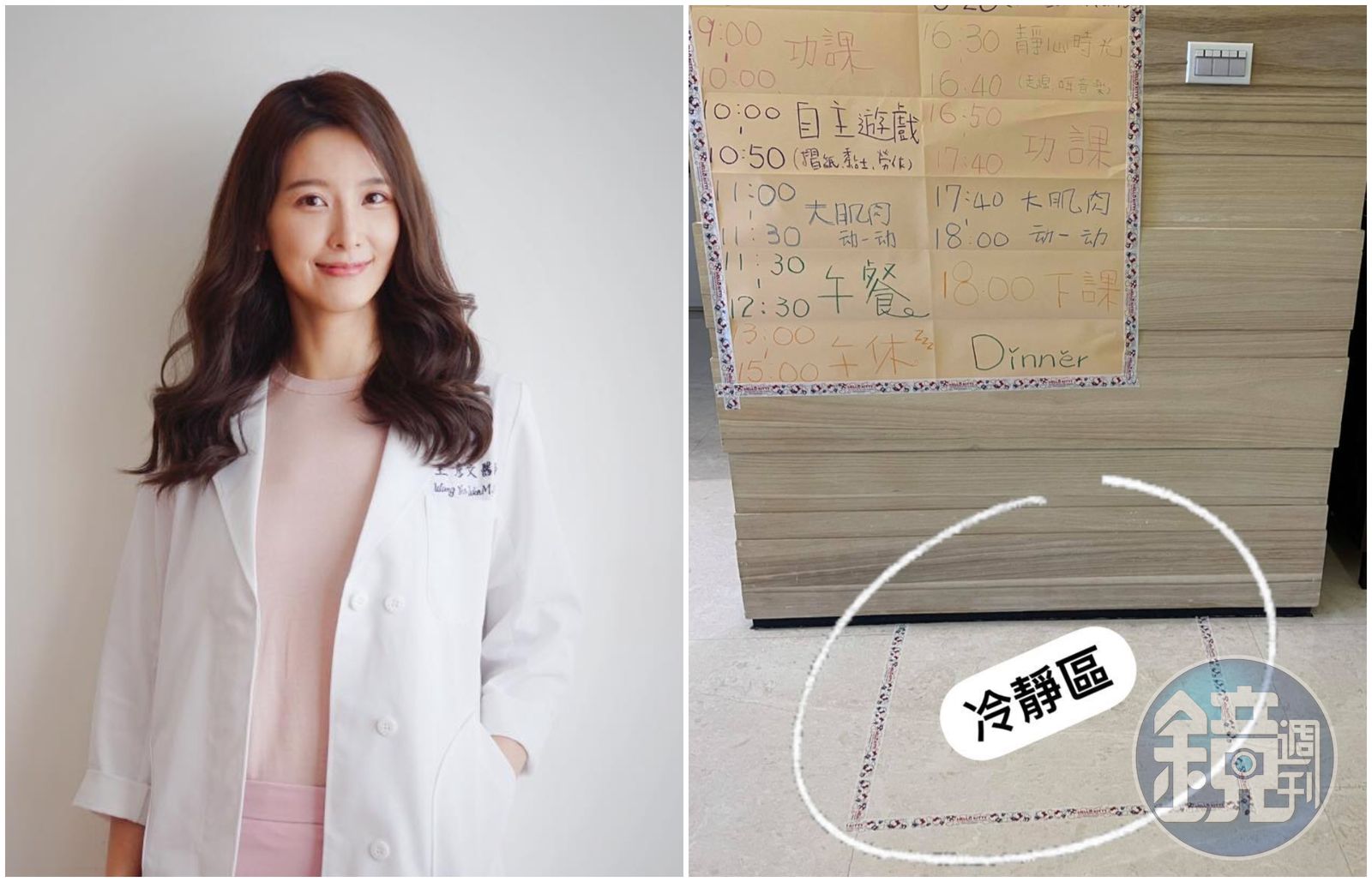 王彥文模仿學校,在家裡空位用紙膠帶貼出「冷靜區」和「走線區」,當孩子們出現失控狀況,就會讓他們到冷靜區思考。走線區則是蒙特梭利課程開始前讓孩子走線靜心用的,她特別在時程表上訂出靜心時段,讓孩子較好進入之後的學習活動。