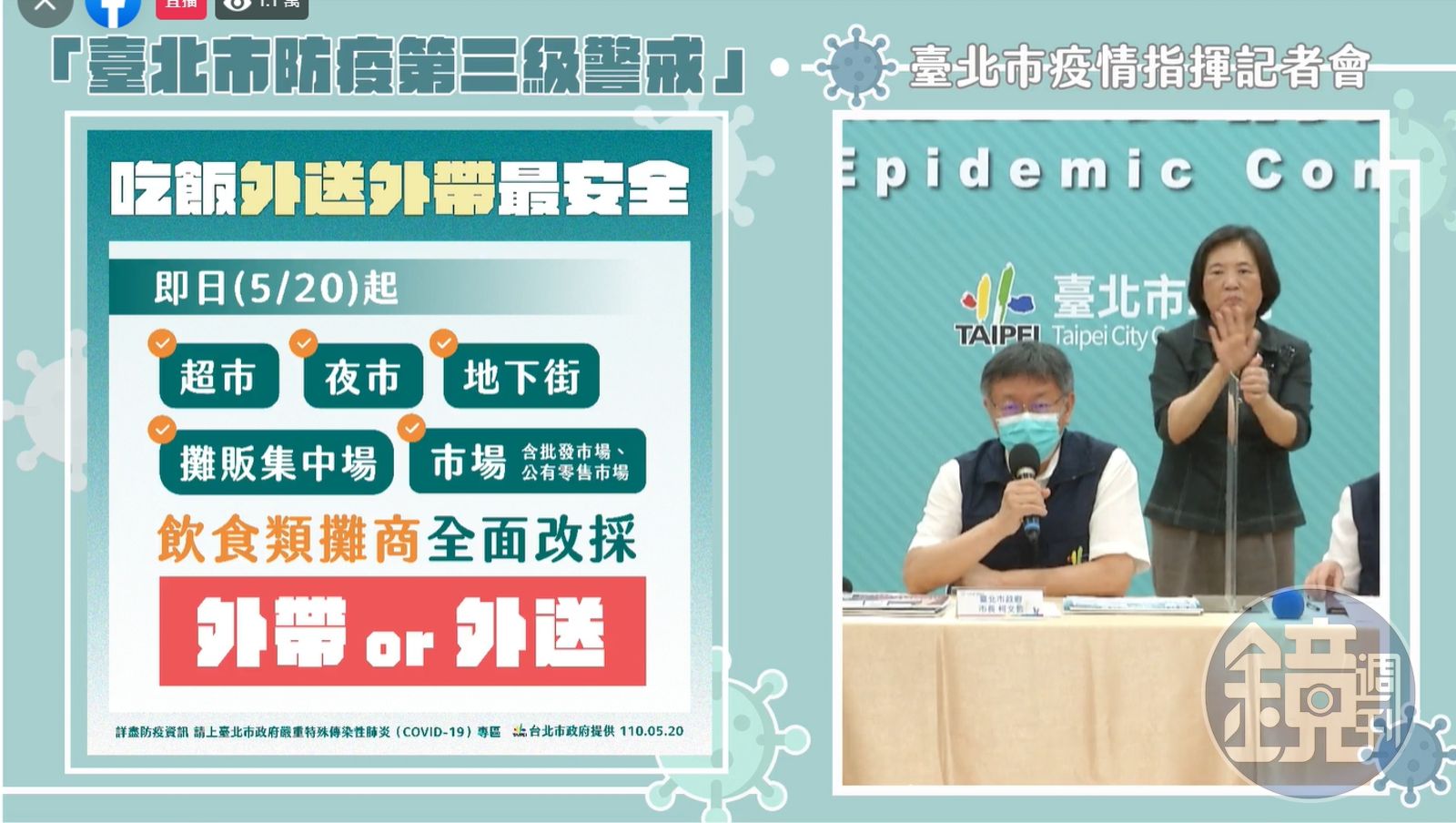 柯文哲表示,今日宣布新的防疫措施,為傳統市場、夜市飲食攤一律外帶、外送,希望大家不要在那裡吃了。黃珊珊進一步說明,會發布行政命令針對、超市、夜市、地下街、攤販集中場、市場、批發市場、公有零售市場等,今日起全面改採外帶或外送,市府會派員稽查;另外針對餐廳,黃珊珊指出有另外的規定。