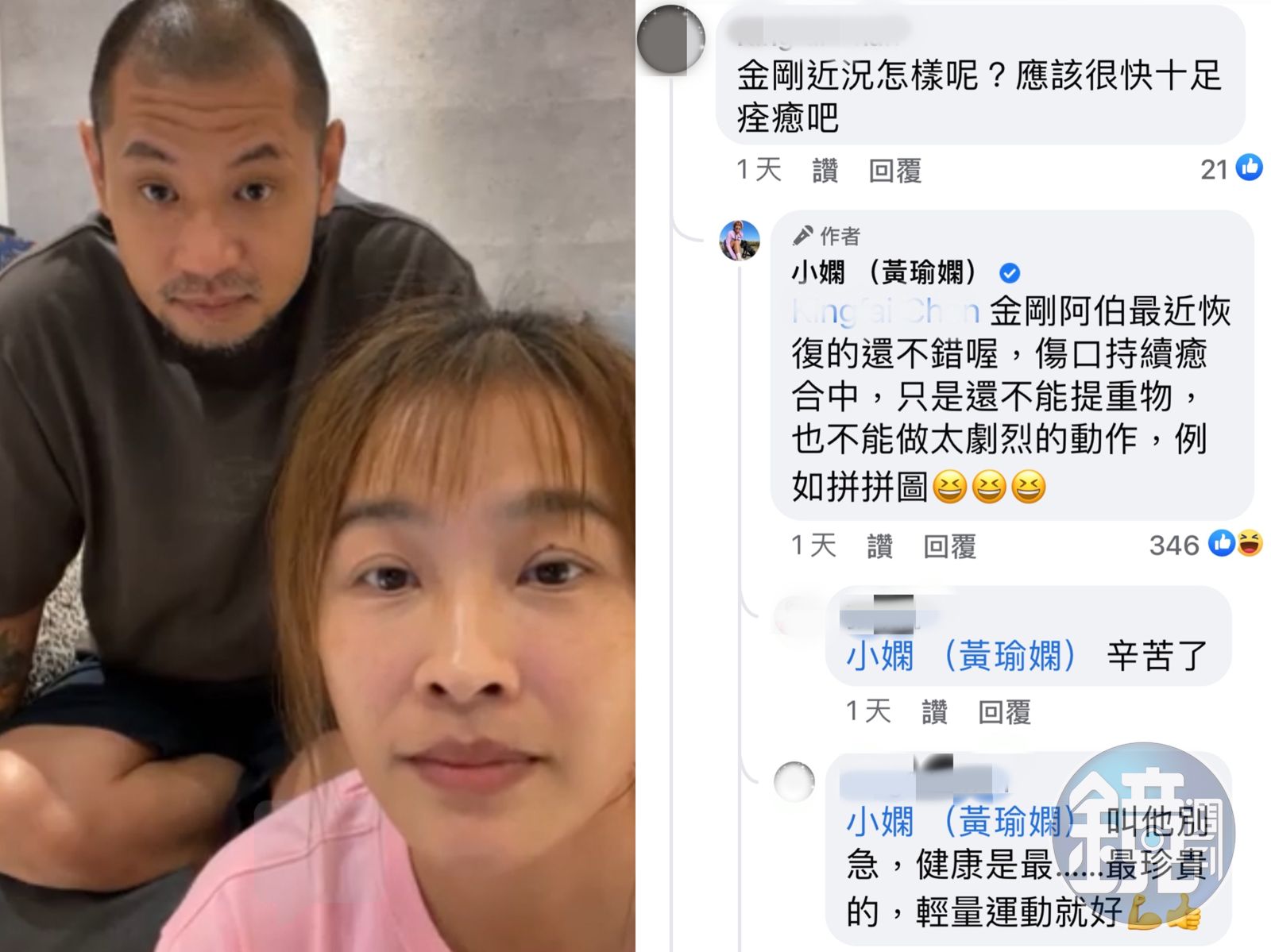 網友紛紛給出意見,也順勢關心了一下金剛的術後恢復進度,小嫻也大方透露,「金剛阿伯最近恢復的還不錯喔,傷口持續癒合中,只是還不能提重物,也不能做太劇烈的動作,例如拼拼圖。」有網友一看見「不能做太劇烈的動作」,還有可放入時事梗歪樓道「例如人與人的連結」,也有網友笑說:「叫他(金剛)別急。」還要小嫻別引誘他。