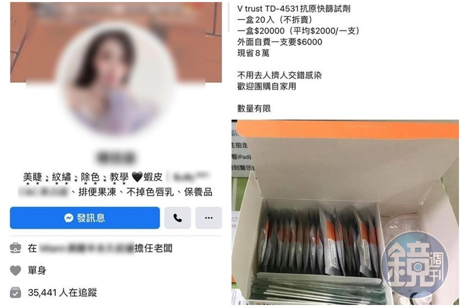 根據《ETtoday》報導,臉書一名近4萬人追蹤網美,經常曬出性感美照分享生活點滴,不過近日該網美被網友爆料,在臉書公開PO文販售快篩試劑,貼文中更表示「不用去人擠人交錯感染,歡迎團購自家用」。