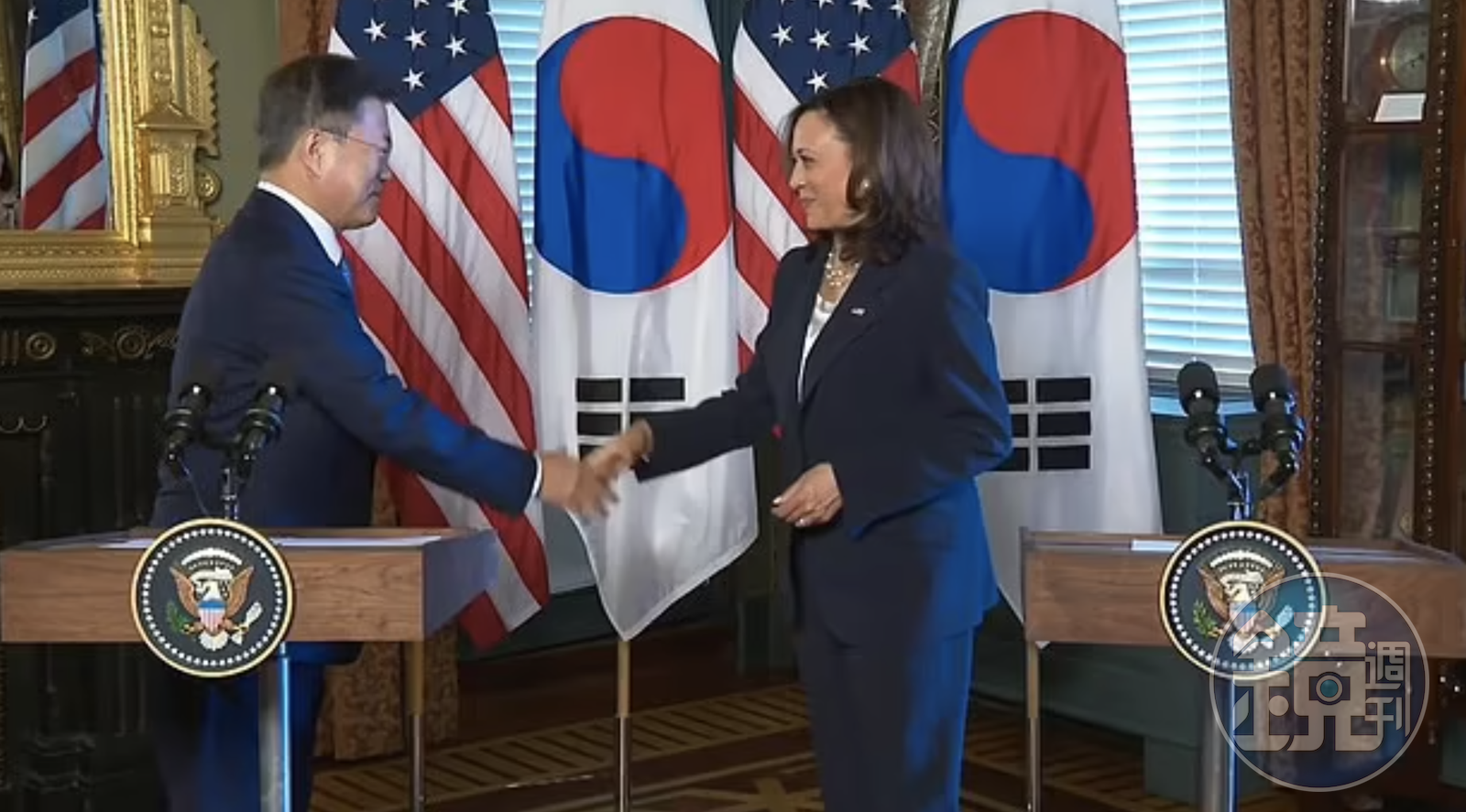 文在寅上週五(21日)與賀錦麗會面,兩人於記者會談論北韓、全球健康與中美洲湧往美國的難民潮根源等議題。根據現場影片,文在寅和賀錦麗都沒戴口罩,握手後,賀錦麗隨即將手放在她的褲子上擦拭,似乎是想清潔自己的手。