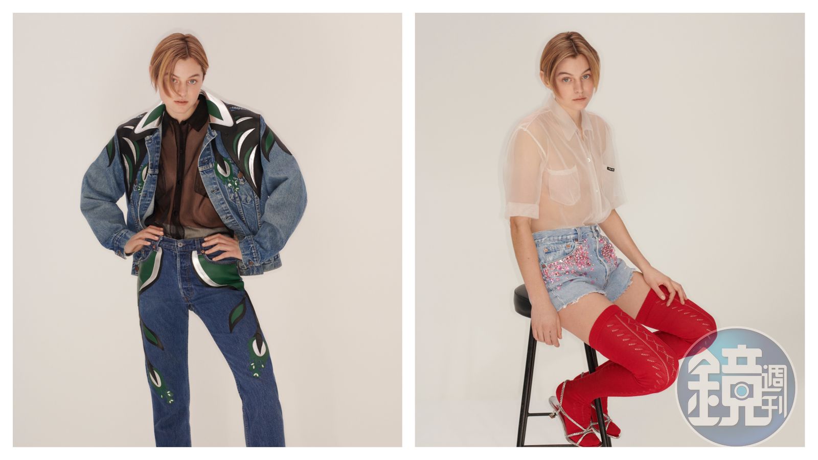 拼接皮革牛仔外套 $125,000 Upcycled by Miu Miu X Levi’s®。(Miu Miu提供)拼接皮革牛仔褲 $93,000 Upcycled by Miu Miu X Levi’s®。(Miu Miu提供)蕾絲水晶牛仔外套 $140,000 Upcycled by Miu Miu X Levi’s®。(Miu Miu提供)復古牛仔手工綴飾極具辨識度的Miu Miu水晶、珍珠、花卉與人造鑽石刺繡,搭配燈籠袖與前衛的裝飾藝術風拼接皮革貼飾。牛仔褲或短及大腿,或點綴象牙白絲質緞翻邊設計,廓形白色蕾絲衣領裝飾Trucker牛仔外套。而這個系列,邀請了品牌繆斯演員Emma Corrin及模特Lila Moss與Georgia Palmer演繹,藉由Johnny Dufort的鏡頭傳達出現下少女的姿態。