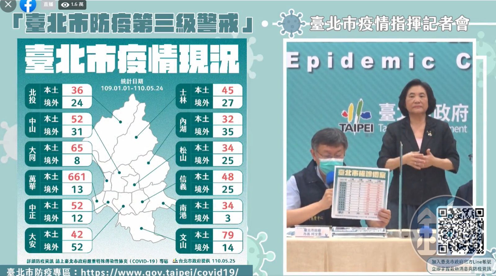 柯文哲也曝光自疫情爆發以來,台北市12行政區的確診累計狀框,其中以萬華區累計661例本土個案最多,至於境外移入則是大安區52例最多。柯文哲直言,最重要的是近兩週的本土個案才是市民關注的重點,第19週(9至15日)萬華區增309例、大同區34例、文山區27例以及中正區26例;第20週(16至22日)萬華區增319例、文山區48例、大同區及士林區都增30例。