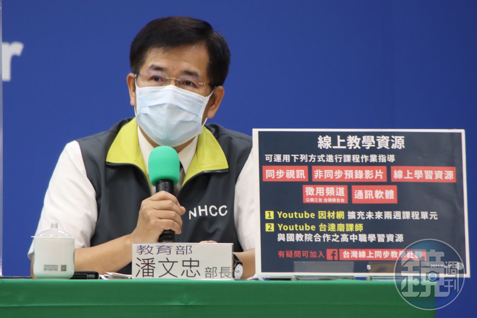 教育部長潘文忠今在防疫記者會上表示,全國各級學校及公私立幼兒園停止到校上課延長至6月14日止,兒童課後照顧服務中心、補習班等各類教育機構亦同。此外,若家中有12歲以下學童及身心障礙子女需照顧者,家長可請「防疫照顧假」;若有高中以下學生(含幼兒園)學生因家長無法照顧等因素不能居家學習者,學校仍會提供學生到校學習、照顧及用餐。