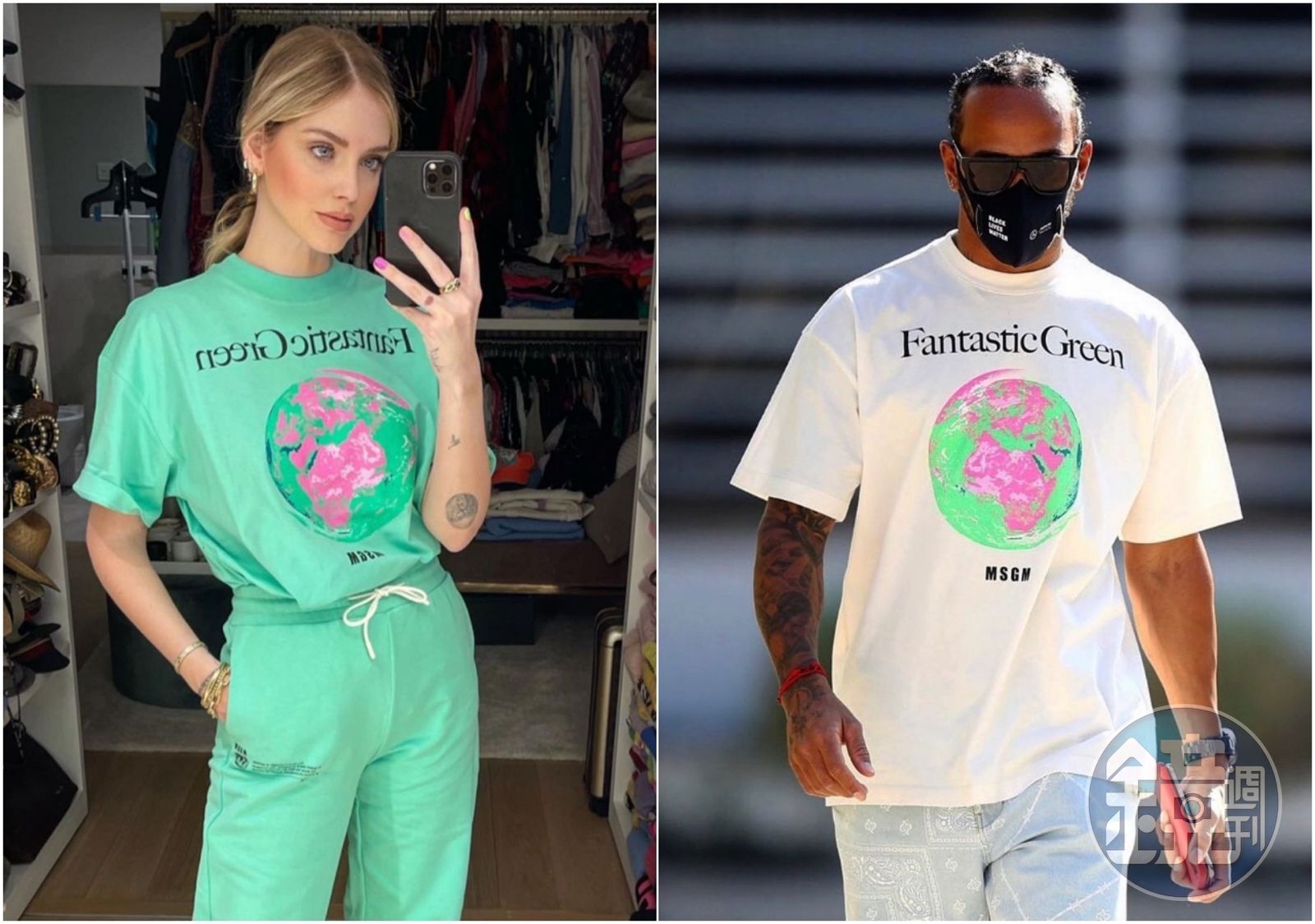 (左起)時尚部落客始祖Chiara Ferragni、F1賽車冠軍Lewis Hamilton,皆穿著MSGM Fantastic Green系列服裝。(藍鐘)發布時間:2021.05.26 13:08 臺北時間
