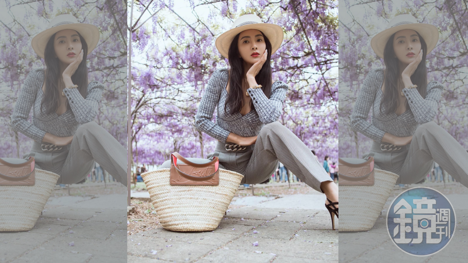 媽咪速玲以一身幹練的裝扮,搭配草帽與草編包在紫藤花下拍照,展現現代女子的俐落度假風。(Christian Louboutin提供)發布時間:2021.05.26 17:32 臺北時間
