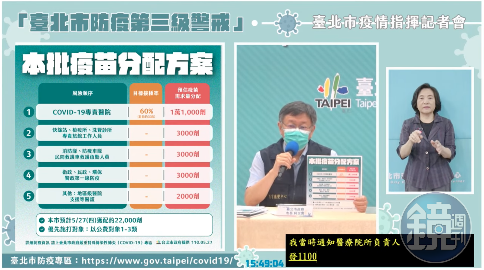 柯文哲今在記者會上表示,最新配發的22,000劑疫苗在今日凌晨已經下來,並且今天各醫院也已經開始施打,按照昨日所說,北市會將11,000劑用在新冠疫苗專責醫院,不過這些醫院的醫護接種率實際上只有33%,這次的1萬劑發下去頂多也只有60%的人能接種到,因此現在只能要求專責病房的醫護先打,第一線的那一圈打完,剩下的就造冊由衛生局管制施打。
