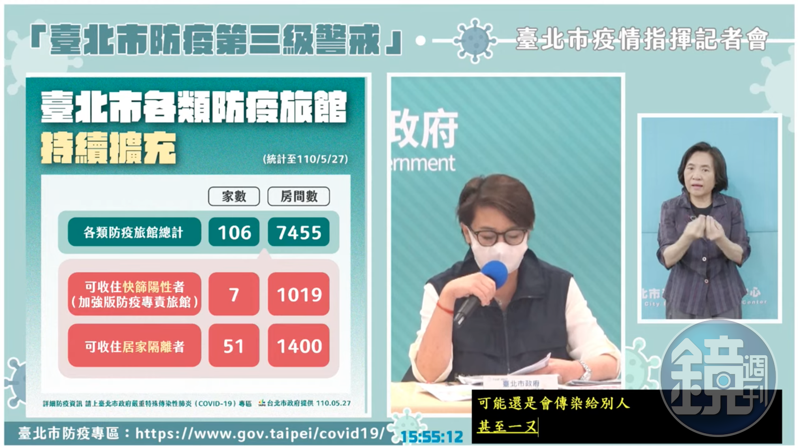 台北市副市長黃珊珊今在記者會上說明北市防疫旅館及專責計程車隊之措施,解釋今早中央放寬規定,讓輕症確診者可以回家,不過回家後要居家隔離17天,未來可能也會變成常態,為確保確診者回家的這段路程不會傳染給別人,會派出專責防疫計程車隊接送。