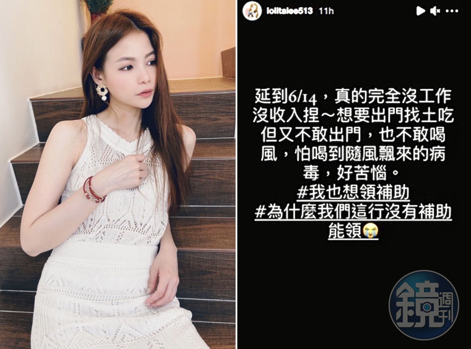 昨日蘿莉塔在限時動態直言因為疫情讓她真的不敢踏出家門半步,「想要出門找土吃,但又不敢出門,也不敢喝風,怕喝到隨風飄來的病毒,好苦惱。」看著政府宣布最新紓困方案,她哭臉直呼好想領補助,「為什麼我們這行沒有補助能領?」