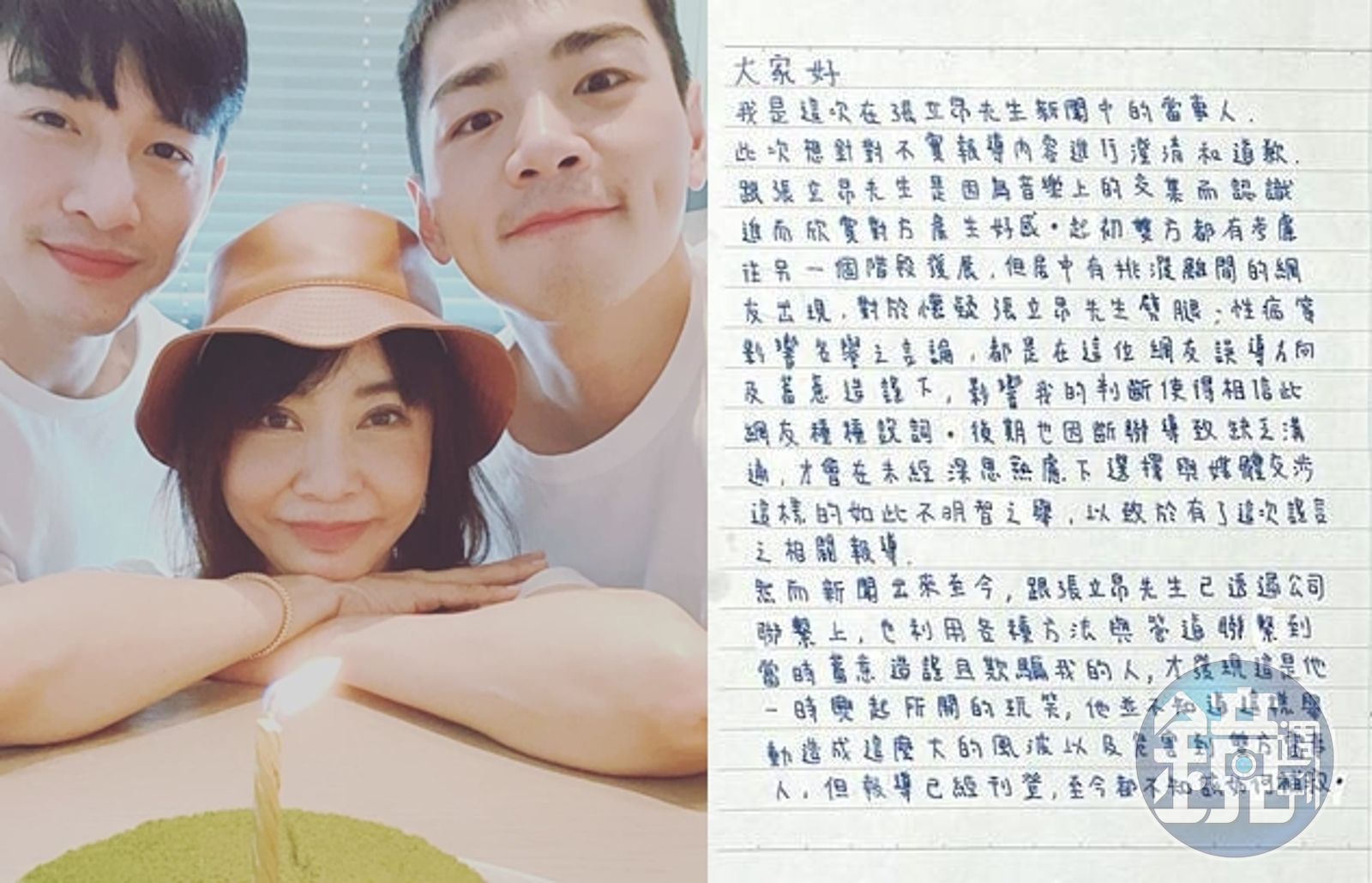 如今張立昂已獲爆料女子道歉,並且聲稱是神祕網友造謠,張立昂在IG上沒多作解釋,僅貼禾浩辰、柴智屏合體照片,並且有感而發:「謝謝妳的信任,謝謝妳無盡的愛護,祝妳永遠美麗永遠健康快樂!生日快樂。」今經紀公司則在他明天生日前,發出女大生手寫道歉信,「對於張立昂先生形象受損感到抱歉,還盼望能夠還原真相並祝福他未來一切安好」。