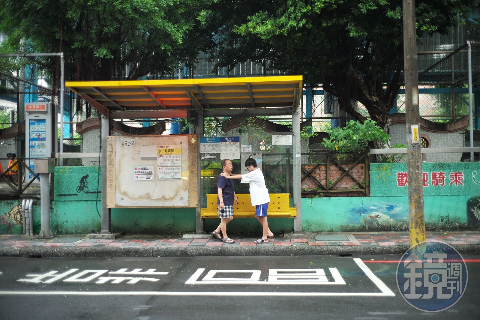 在公車站一起等車的父子。發布時間:2021.05.30 10:00 臺北時間