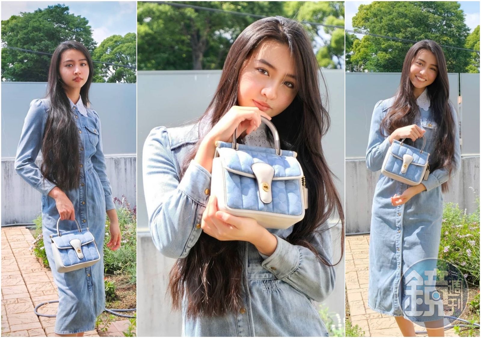 COACH代言人木村光希穿的石洗丹寧襯衫連身裙NT$23,800、Willis 18丹寧緹花面料頂部提把手袋NT$19,800。發布時間:2021.05.28 11:23 臺北時間