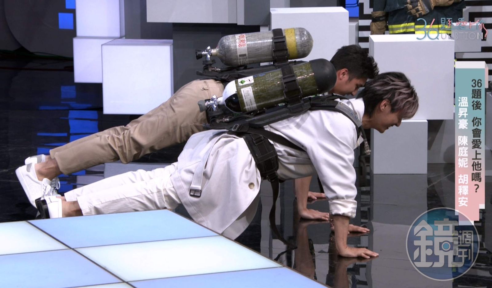 炎亞綸為體驗演員們的感受,跟著胡釋安背起裝滿液壓空氣的沉重氣瓶,只見胡釋安專業地指導他說「你就是像這樣揹書包一樣揹上」,沒想到炎亞綸興致滿滿地想負重跟胡釋安尬伏地挺身,結果10下做完,炎的臉直接脹紅,起身來大吐一口氣,把一旁《火神的眼淚》海報拿起來怒吼說「這個戲怎麼沒找我?我要生氣了」,惹現場大笑。