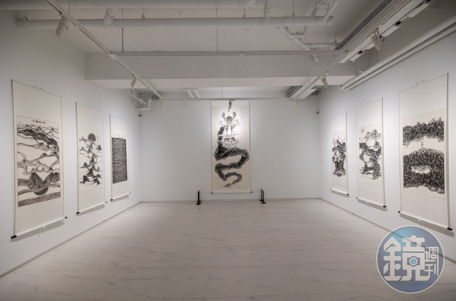 展場二樓則以微暗柔和的燈光凸顯終南山的朦朧月色,伴隨空間中樊洲悠揚的古琴演奏,交織出一場水墨月色、古琴音律的視覺饗宴,讓觀眾不自覺沉浸其中,以舒緩的步調欣賞一幅幅精彩的作品。