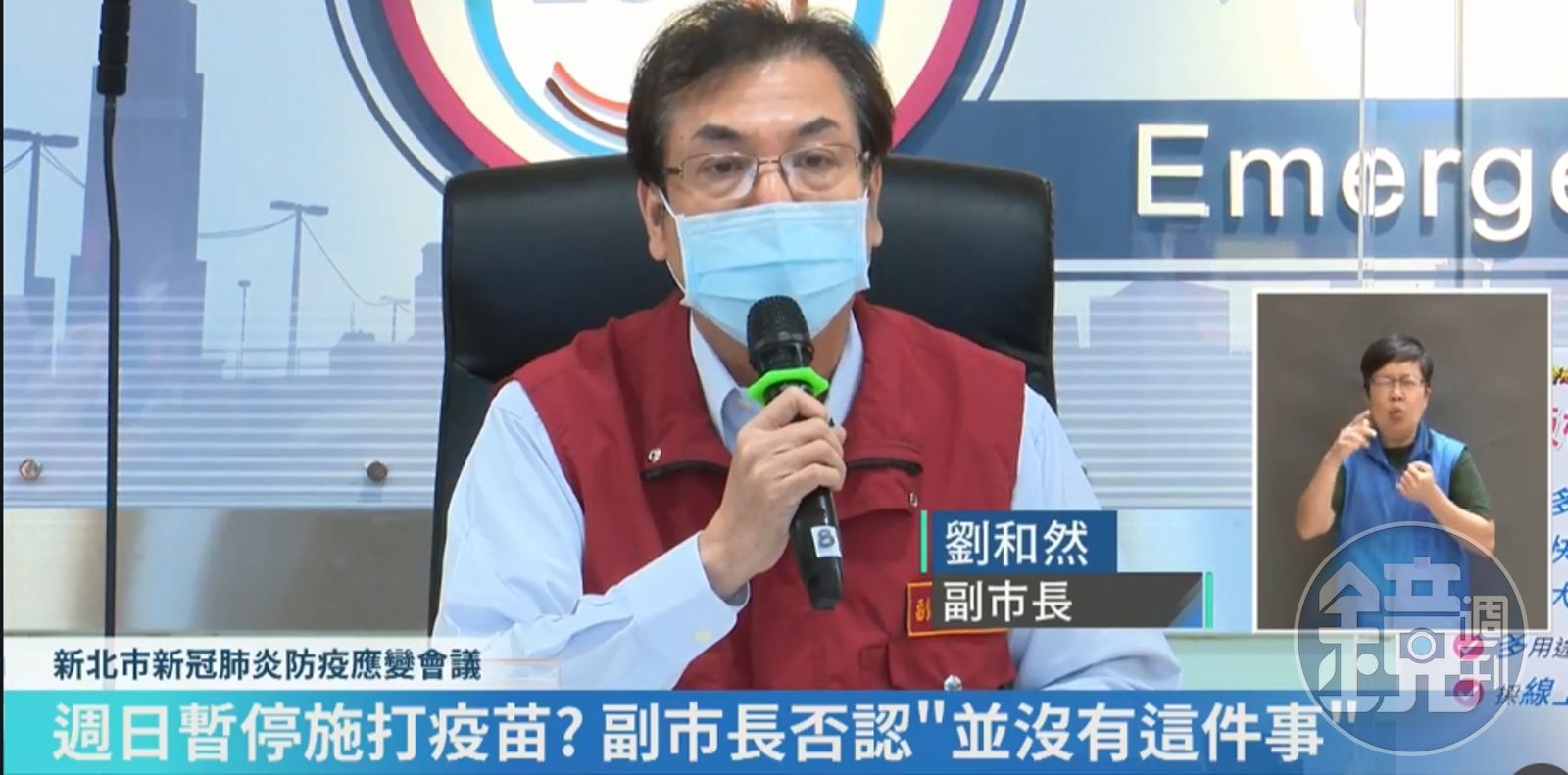 針對前立委段宜康質疑新北市為什麼週日暫停施打疫苗,副市長劉和然回應,這次的疫苗主要是針對負責專責第一線的醫護同仁,疫苗施打授權給各醫院安排,強調「今天一定會施打完畢」。劉和然說,今天1.8萬劑將施打完畢,第二批將配發3.9萬劑,新北市將以一到三類人員優先。