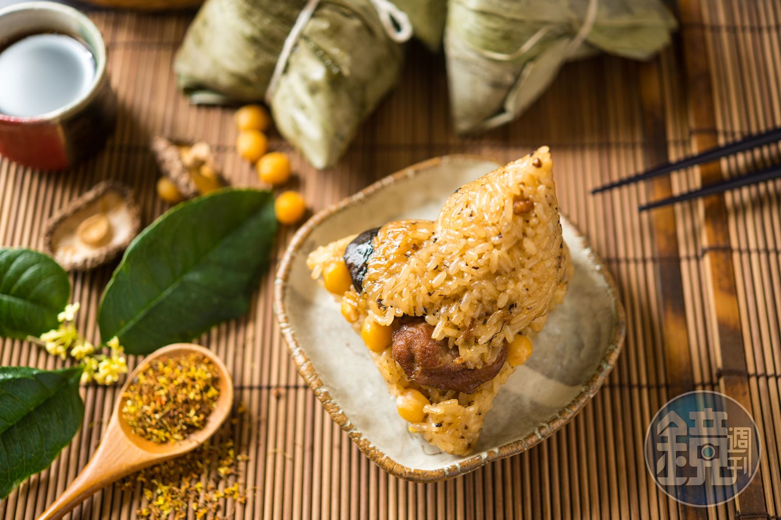 老闆林銘木最初因新竹內灣的野薑花粽產生了靈感,不過比起做出甜桂花粽,他更希望能讓桂花入鹹粽而不違和。林銘木將桂花泡成桂花茶湯,倒進糯米中攪拌使其入味,再將泡過的細碎桂花瓣微炸,香氣更突顯後再次拌入糯米。本身就走淡雅路線的桂花香和著粽香好像若有似無,卻在慢食細嚼間隱隱齒頰留香。