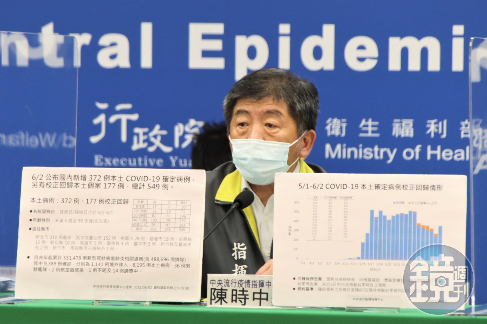 指揮中心表示,今日新增之372例本土病例,為207例男性、165例女性,年齡介於未滿5歲至90多歲,發病日介於今年5月2日至6月1日。另校正回歸個案177例中,為96例男性、81例女性,年齡介於未滿5歲至80多歲,發病日介於5月13日至5月30日。