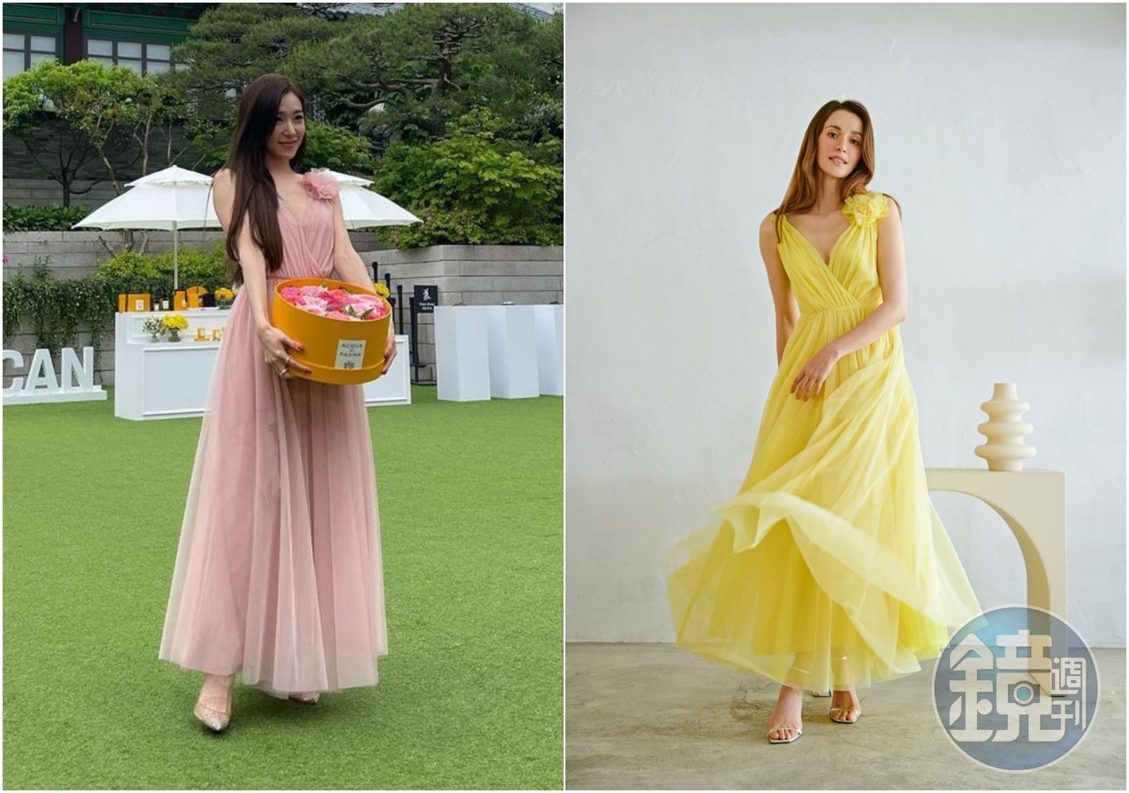 Tiffany身穿BLUMARINE軟糖粉色花卉雪紡長洋裝。NT$32,800(藍鐘提供)Tiffany在出席活動時穿著軟糖粉色花卉雪紡長洋裝,飄逸長裙將雪紡紗材質的流暢線條與層次設計完美展現,襯托出她浪漫柔美的女神風格;瑞莎穿著的淺鵝黃色長洋裝多了一分俏麗,最適合和老公獨處時小露性感。