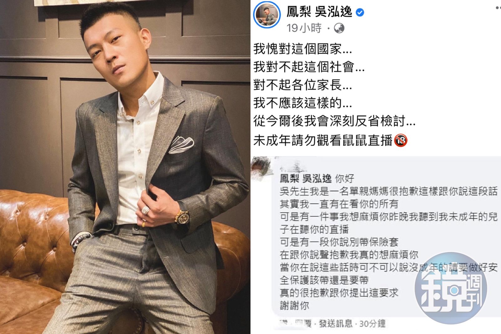 對此,鳳梨也感到不對勁,趕緊在臉書貼文表示道歉,「我愧對這個國家⋯我對不起這個社會⋯對不起各位家長⋯我不應該這樣的⋯從今爾後我會深刻反省檢討⋯ 未成年請勿觀看鼠鼠直播。」雖然這個家長的態度讓網友很讚賞,但也有不少人認為小孩教育問題不該是由鳳梨來扛,應該回歸到這位家長,要求鳳梨做自己就好。