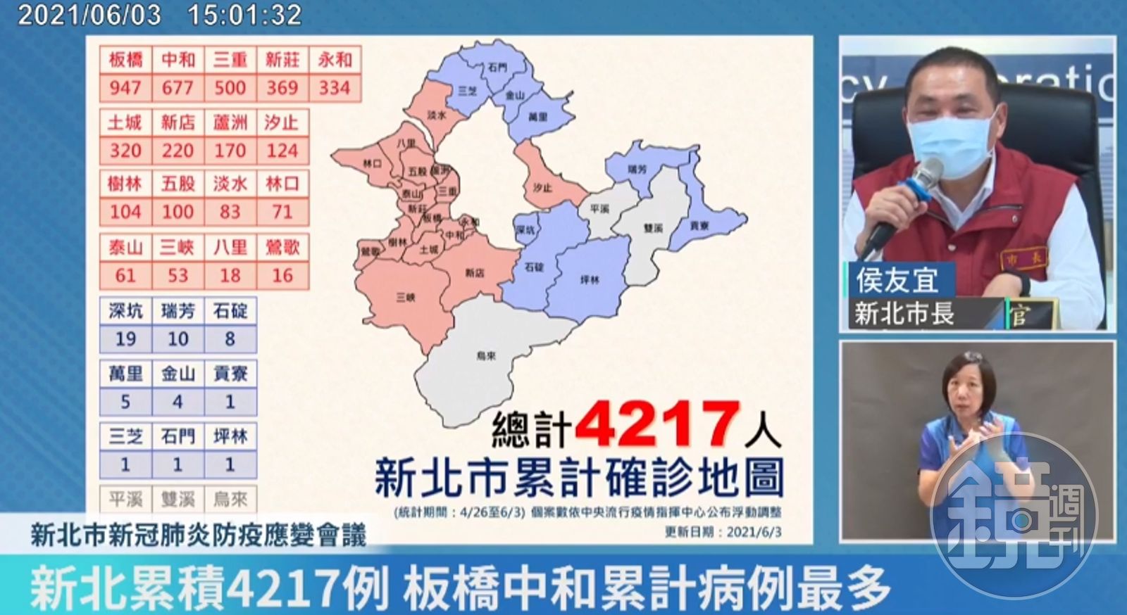 截至3日為止,新北市累計確診達4,217人,以板橋區947例最多。(翻攝自我的新北市臉書直播)發布時間:2021.06.03 16:22 臺北時間