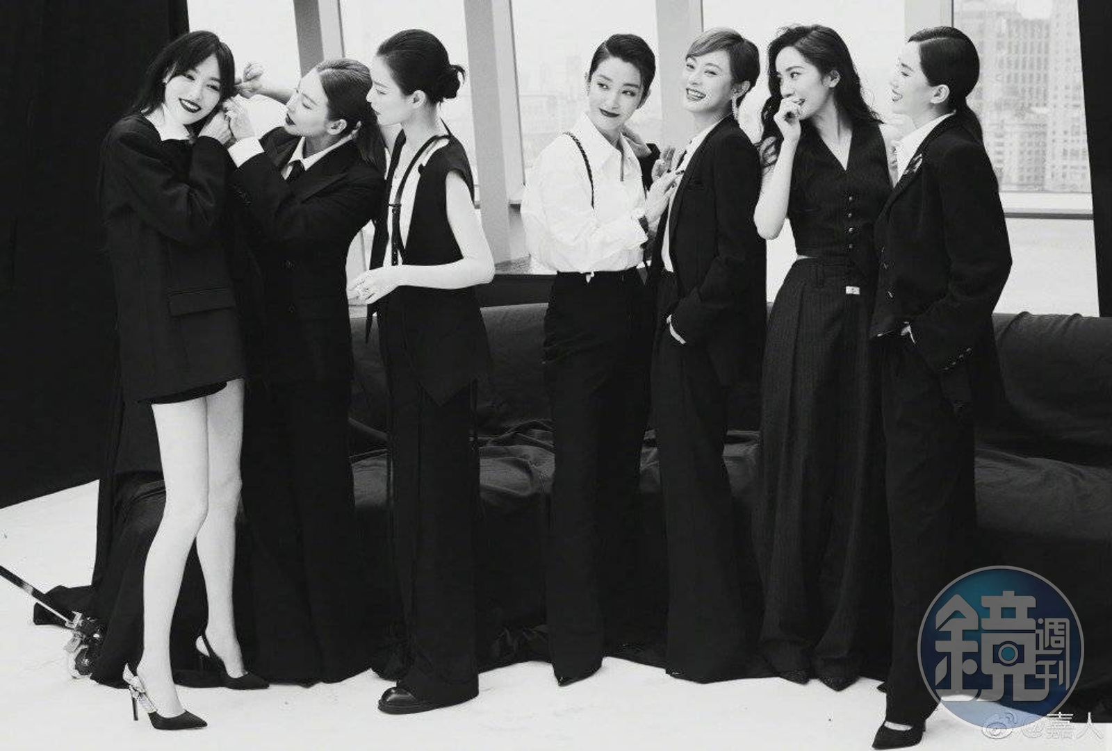 另一張大合照,C位的孫儷與李冰冰完全被網友無視,反而各在兩端的唐嫣及楊冪成了焦點。(翻攝自嘉人微博)而另一波官方釋出的黑白合照更粉絲沸騰,破冰成功的楊冪與劉詩詩形影不離,怎麼拍兩人都黏緊緊,劉詩詩的頭還靠在楊冪的肩上,曖昧氛圍到了極點;反觀同樣也是《仙劍3》主角群,且過去也是楊冪閨密的唐嫣,卻與楊冪相隔大老遠,即使後來換到楊冪這邊來,劉詩詩依然卡在中間,看來兩人斷開已久的姐妹情,暫時還看不見有和好的曙光。