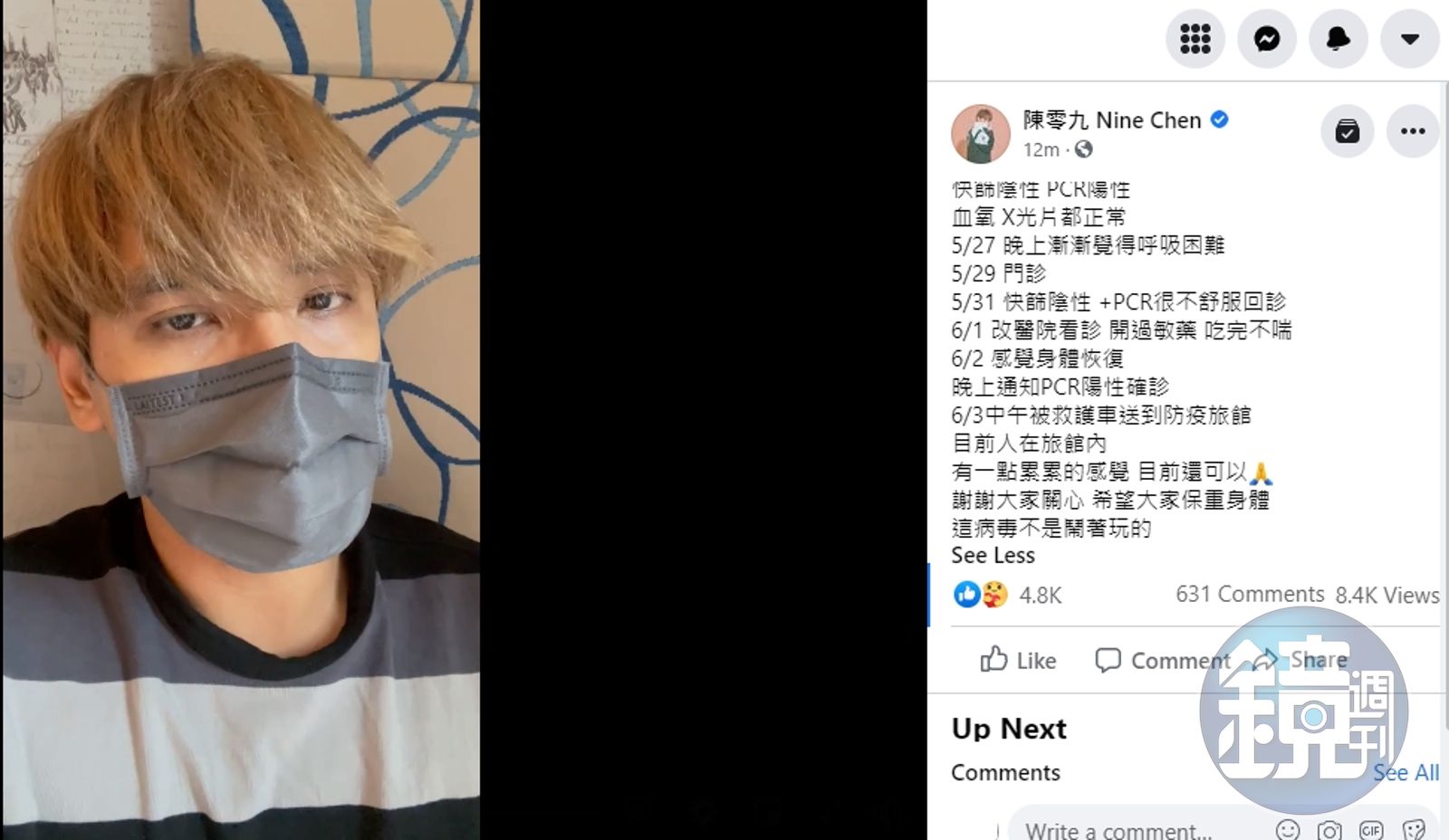 陳零九也透露,「有一點累累的感覺,目前還可以,謝謝大家關心,希望大家保重身體,這病毒不是鬧著玩的。」並表示自己沒什麼症狀。