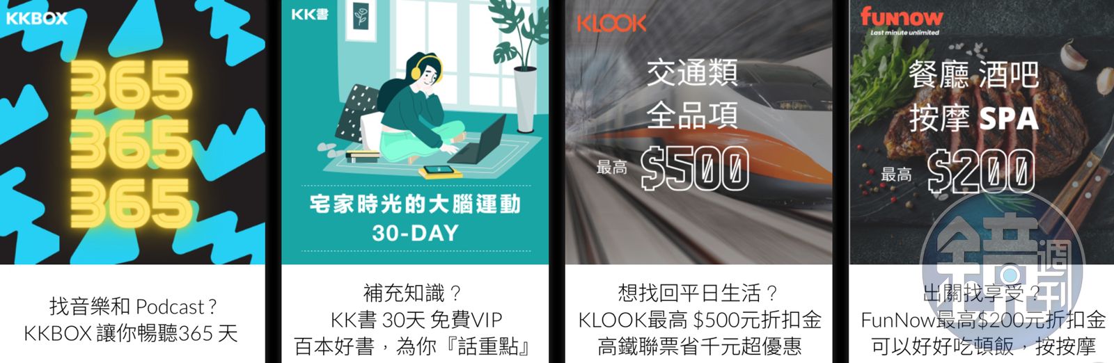 這項專案從即日起至7月1日前,限時優惠999元,內容包含「365天KKBOX+30天KK書+500元KLOOK折扣金+200元FunNow折扣金」,在「FUN心在家」活動網頁,輸入購買方案電子發票資訊,即可領取折扣金,這些折扣金在12月31日前皆可使用。