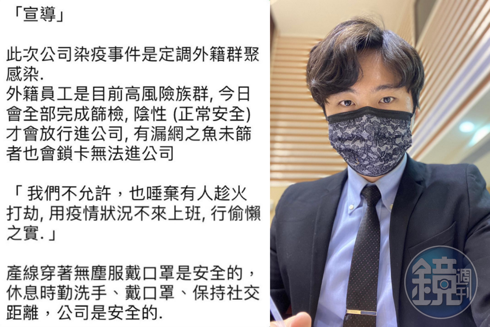 甚至信件中公司高層還表示「此次是外勞群聚造成」「今後只有陰性允許進線,且產線穿無塵服戴口罩是安全的,休息時勤洗手、戴口罩、保持安全距離,就安全了」,頗具爭議的內容讓曾玟學傻眼表示,先不論快篩後有偽陰性的可能,「你們的無塵口罩就不具備醫療口罩的防護能力」,直批「還沒篩過的人為什麼先被call回來上班,這跟今後只有陰性允許進線不是相違背?直接自己打臉嗎」?