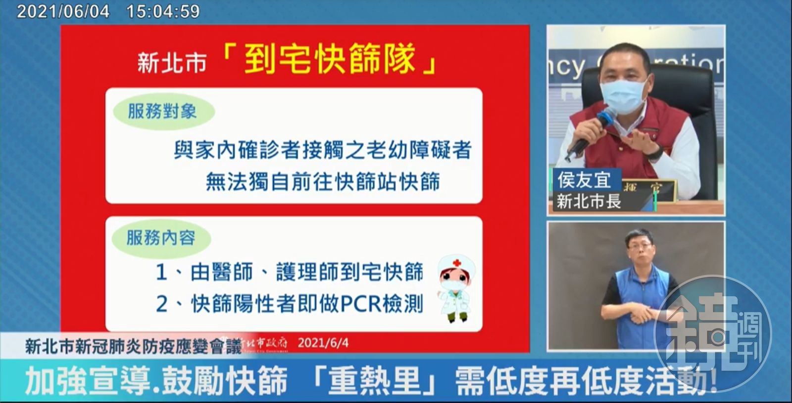 侯友宜下午說明新北今天最新疫情表示,新北仍以板橋最多人,但新莊、汐止確診數也都有上來。侯友宜希望市民能更加低度再低度的活動,並呼籲高風險「重熱里」居民都出來快篩。 至於有很多與家內確診者接觸之老幼障礙者、無法獨自前往篩站快篩的市民,新北市也推出「到宅快篩隊」由醫師、護理師到宅快篩或是快篩陽性者做PCR檢測。 社會局長張錦麗進一步說明,醫院的醫師、護理師會到宅快篩,如果快篩陽性將立即做PCR檢測;並不是所有人都可以使用,是以「家內確診者接觸的老幼、障礙者,且無法獨自前往快篩站快篩的人」。
