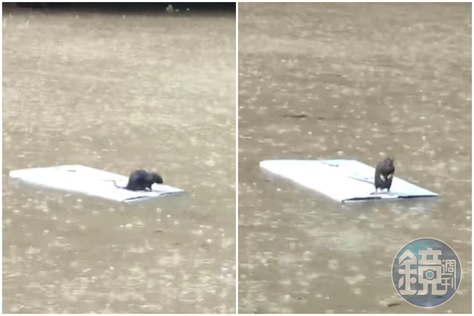 一隻老鼠因為淹水被困在白色板子上四處漂流,看起來非常無助。(翻攝爆廢公社)發布時間:2021.06.04 18:44 臺北時間