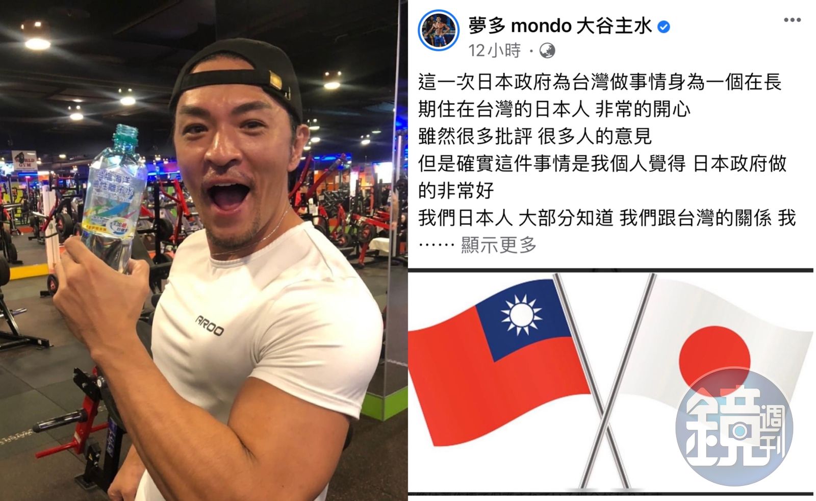 就在台灣急缺疫苗防疫之際,日本政府昨(3)晚間宣布將捐出124萬劑AZ疫苗,並在今(4)日下午送抵台灣。深耕台灣多年的日籍藝人「夢多」大谷主水,也在昨(3)晚於臉書貼文針對故鄉善舉感到榮耀,並附上台日兩國國旗表示,「我們真的是好朋友」,讓台灣網友相當感動。