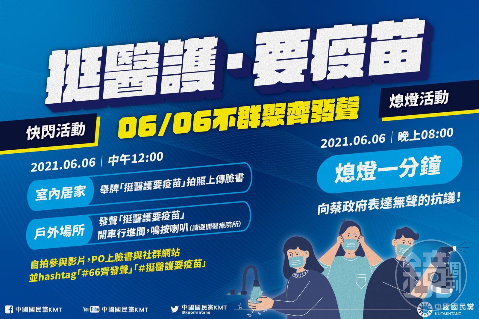 國民黨近日公布「挺醫護要疫苗、6/6齊發聲」快閃行動辦法,中午12點時,在開車行進間鳴按喇叭、在住宅內敲擊玻璃、鍋碗瓢盆、在走路步行間大聲吶喊「挺醫護要疫苗」或大聲鼓掌,並於當日晚間8點熄燈一分鐘向蔡政府表達無聲的抗議。而ICU醫生陳志金則在臉書上轉貼消息指出,如果了解醫護人員的作息就會知道,有部分醫療人員在補眠中,這是在擾人休息。