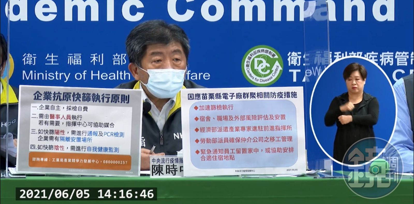 指揮中心指出,截至6月4日,第1家電子公司共計131案確診(14名本國籍、117名外國籍),已匡列接觸者323名,均已採檢;第2家電子公司共計9案確診。