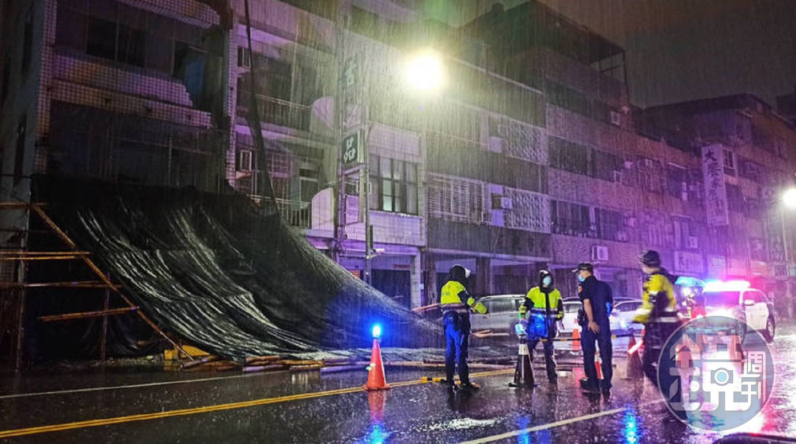 高雄市區多處鷹架、路樹倒塌路中,警方冒雨排除協助疏導,今(6)天凌晨1時40分許接獲通報,前金區大同路324之3號有鷹架倒塌形成道路障礙,派遣警網趕往事故地點處置,倒塌的鷹架佔據約3個車道(長、寬約6公尺),影響用路人安全,迅速警戒、搬離。