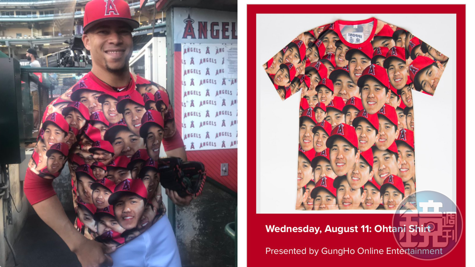 這件大谷T要回溯到2019年9月25日,天使隊在主場迎戰運動家隊時,例行性推出搞怪衣服,凡是進場的球迷都能獲得一件大谷T,衣服底色為紅色,上面布滿大谷翔平的笑臉,看起來有些獵奇,卻意外獲得球迷喜愛,天使隊終結者羅伯斯(Hansel Robles)、美國職籃多倫多暴龍隊的日籍球星渡邊雄太也都曾穿上這件衣服露出燦爛笑容。