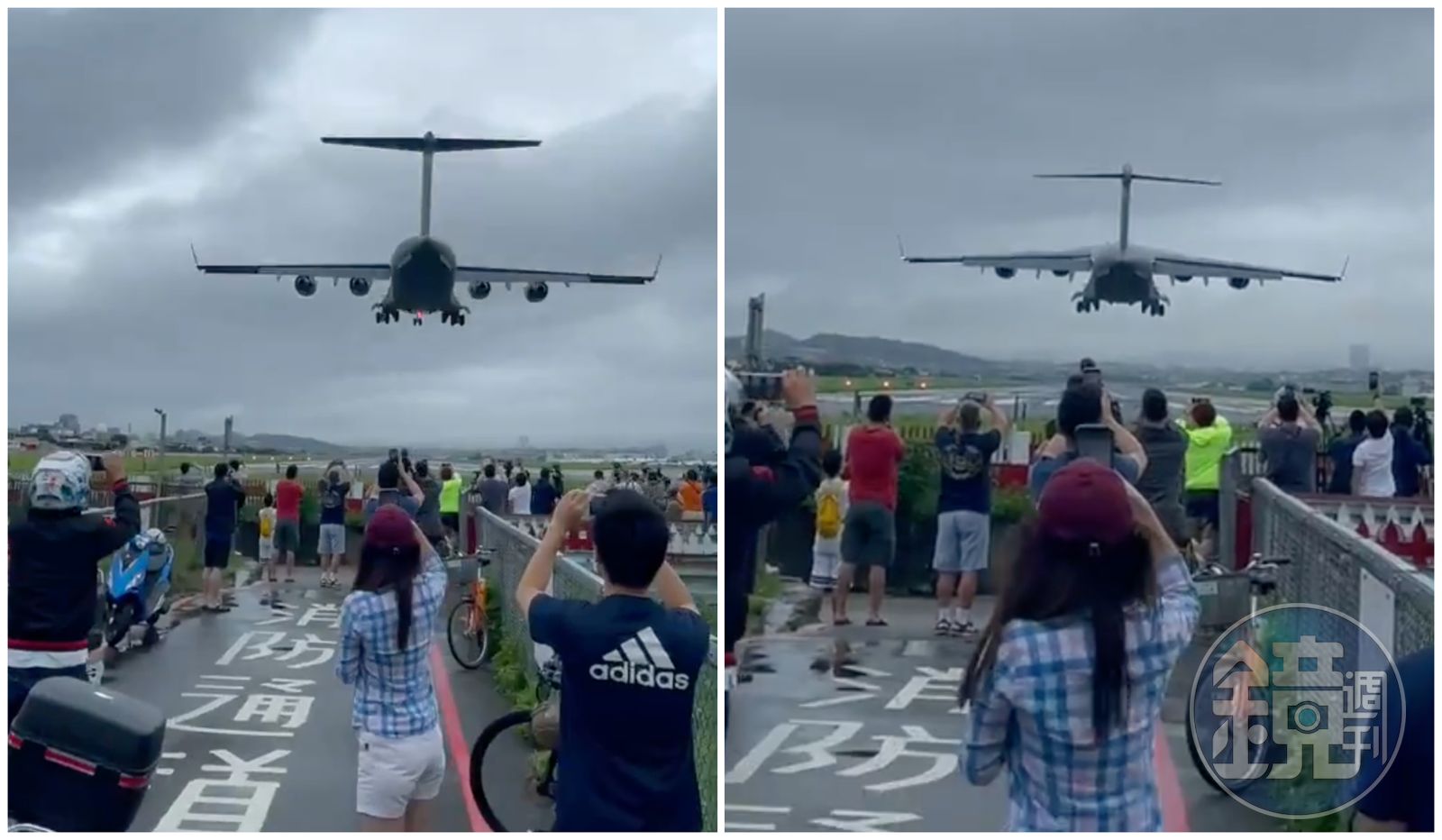 【有片】美國C-17降落台灣 「民眾擠飛機巷搶拍」網驚:群聚?