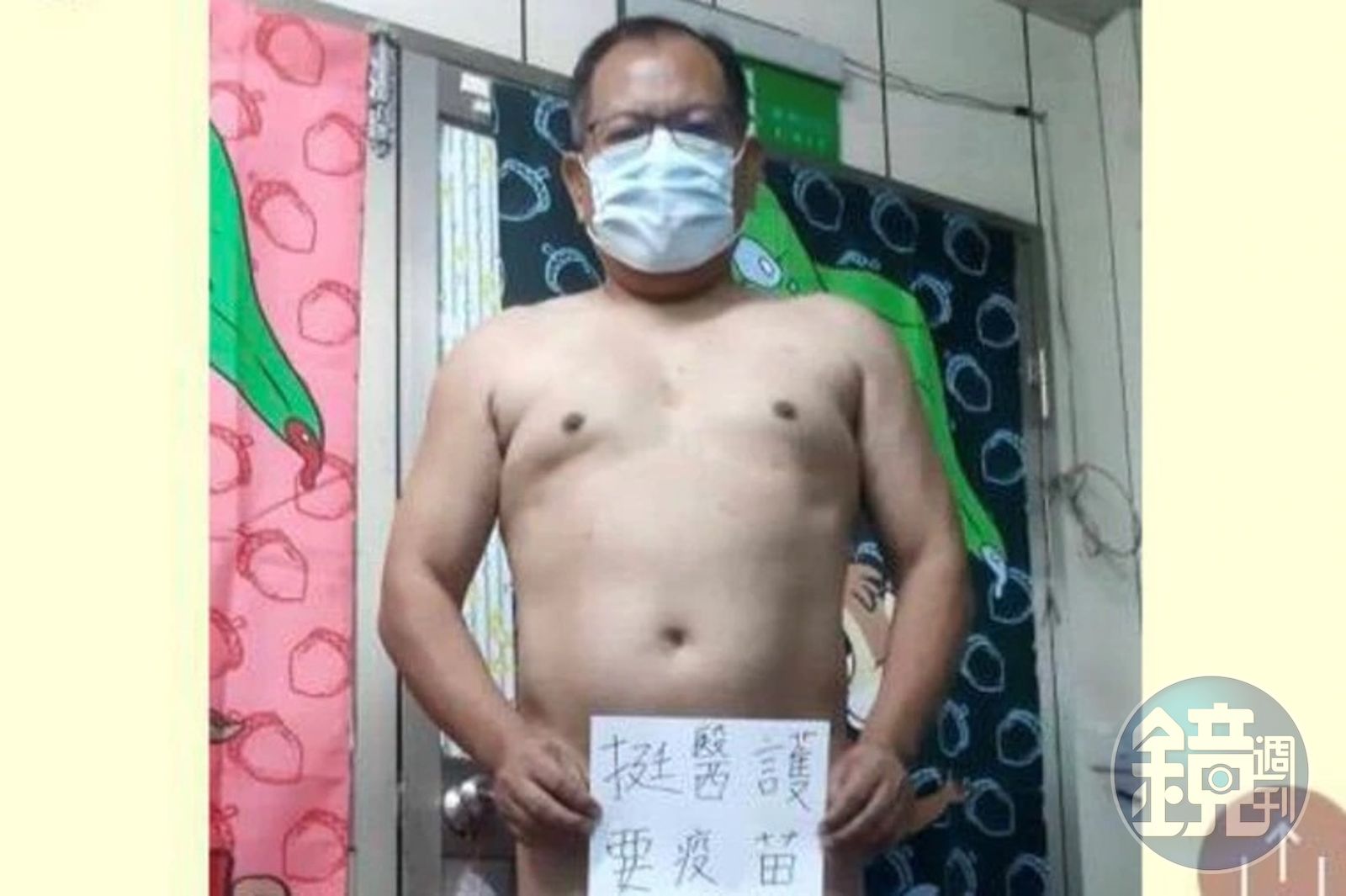國民黨台東縣議員古志成日前手拿著「挺醫護,要疫苗,加油!」的A4紙,遮擋住下半身拍下全裸照,將全裸照上傳到當地2個村里的LINE防疫群組中,照片中,除了配戴口罩之外什麼東西都沒有穿,拍完上傳後,還傳訊息表示,「什麼都不要~只要疫苗」。