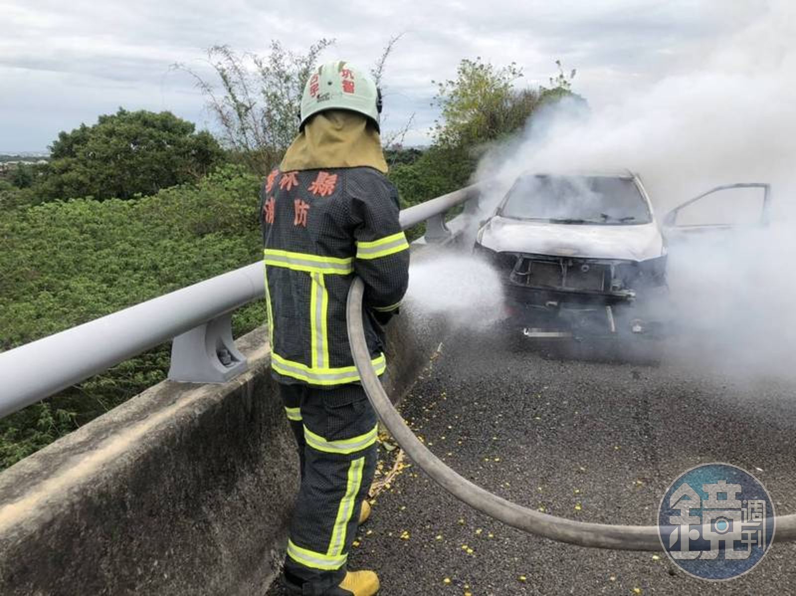 雲林縣消防局勤務中心係於今天中午13時12分接獲報案,指國3南下車道270公里、古坑鄉路段,一部停在路肩的自小客車起火燃燒,消防局立刻派員前往灌救,但抵達現場時,整部車子陷入烈焰當中,無法確定車內是否有人受困,雖然10分鐘之後將大火撲滅,但駕駛座上驚見一具蜷曲的焦屍。